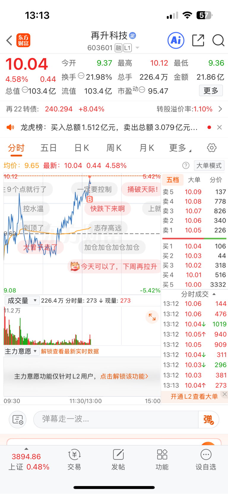 $再升科技(SH603601)$ 中央商城炸板出来,成功买到山顶