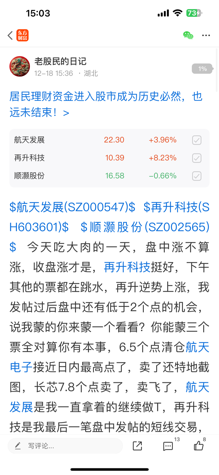 $再升科技(SH603601)$ $航天发展(SZ000547)$ $雪人集团(SZ002639)$ 2天收获20个点,操碎了心,尾盘又是加又是减的,看到1.6亿大佬压在10.4元,真是牛啊,最近的行情很难,做核心做前排每天都是牛市,做杂毛每天都是熊市,目前重仓持有再升,雪人,航天发展,都是核心,还有几个之前说的波段票没动