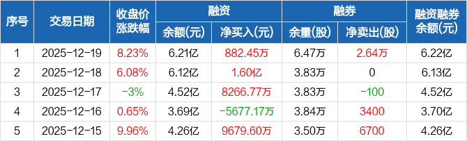 融资方面,当日融资买入3.86亿元,融资偿还3.78亿元,融资净买入882.45万元,连续3日净买入累计2.52亿元。融券方面,融券卖出2.64万股,融券偿还0股,融券余量6.47万股,融券余额67.22万元。融资融券余额合计6.22亿元。