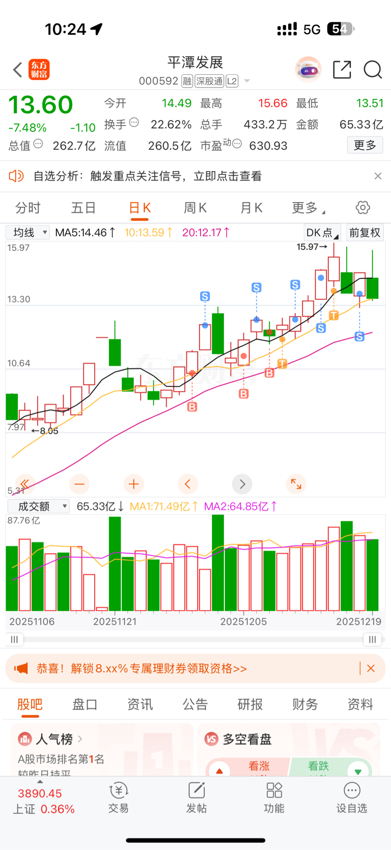 本周共买入三只股票,$平潭发展(SZ000592)$ 三进三出,有点不对劲了,先溜了;$航天发展(SZ000547)$ 买入当天尾盘咋了,没走、留了两三天,软绵绵,且航天各自为战,先撤了;$再升科技(SH603601)$ 目前收益不错。本周收益为正6.5。