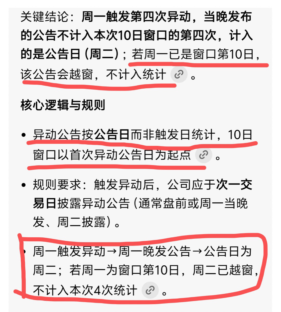 $再升科技(SH603601)$ 再升科技周一涨停不会触发四次异动,因因周一晩上异动公告发岀来计入到周二,该公告会越窗,刚好卡过最后一天的时间线上,如下图内容:
