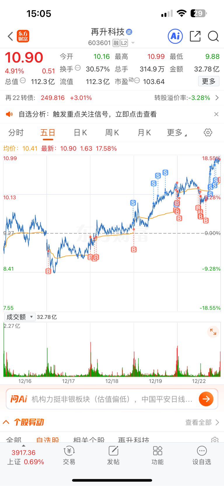 $再升科技(SH603601)$ $浙江世宝(SZ002703)$ $山子高科(SZ000981)$ 再升目前是主板近一个月涨幅第一了,辨识度很高,异动暂时也没有了,周四盘中明牌说到现在,昨天晚上就在想,再升太明牌了,所有人都知道它今天是卡异动,而且只有5个点的空间,稍微红开一点散户一跟风就很容易冲高,所以今天只能低开,拉开空间,甚至杀到深水跌停然后散户挂卖单立马吃掉,把先手都消耗掉,上午看到主力的操盘很放心,评论区也基本一片看空了,下午大跌继续加仓,一股不卖,基本重复了上周五的故事,区别在于今天下杀的多一些,2到5个点底仓出完了,竞价又加了一笔,另外上午5.55吸了一笔永辉,早上低吸了天银机电,尾盘拿了点航天电子