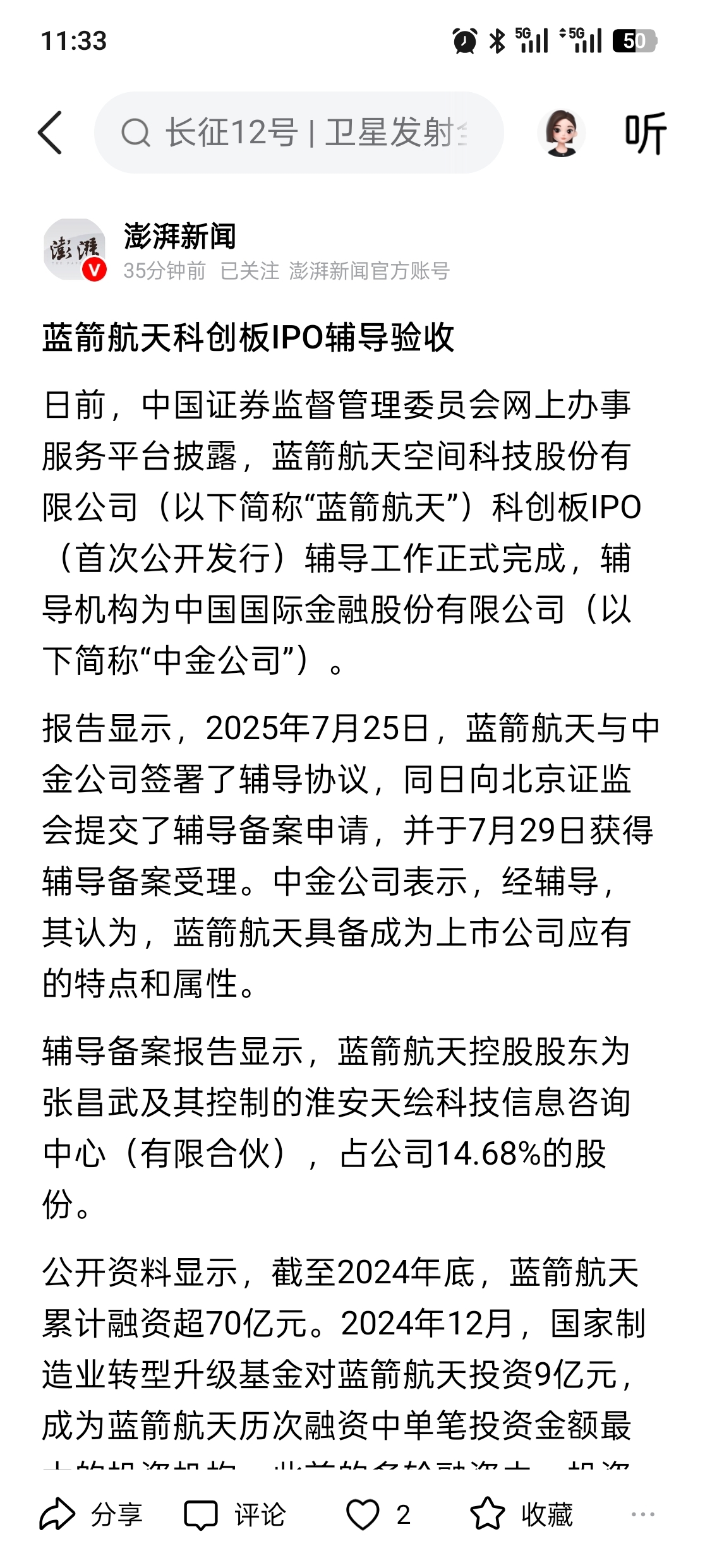 $再升科技(SH603601)$ 蓝箭IPO验收成功