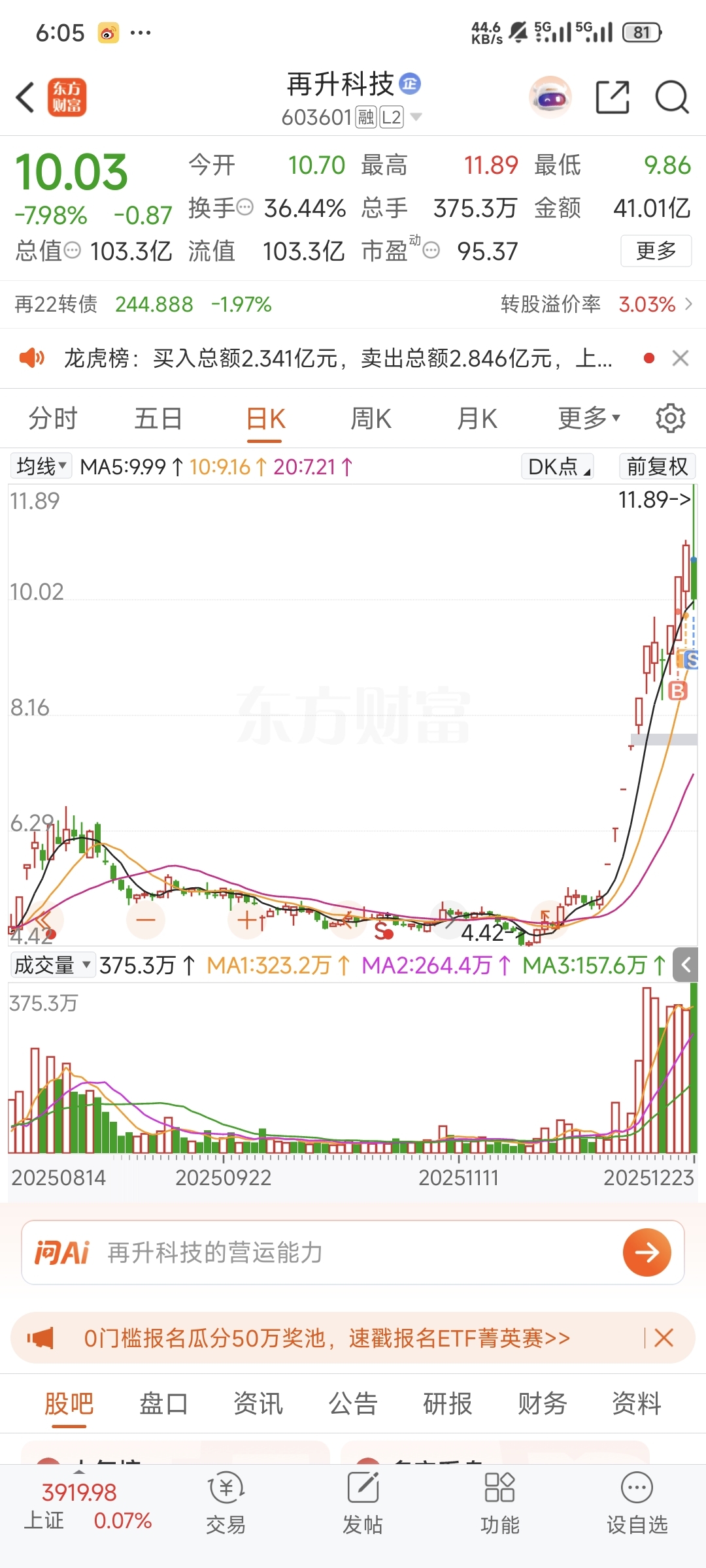 $再升科技(SH603601)$ 祝你们好运,在下不才就吃10个点跑了,风险大于收益,就是赌这种赌赢的概率极低
