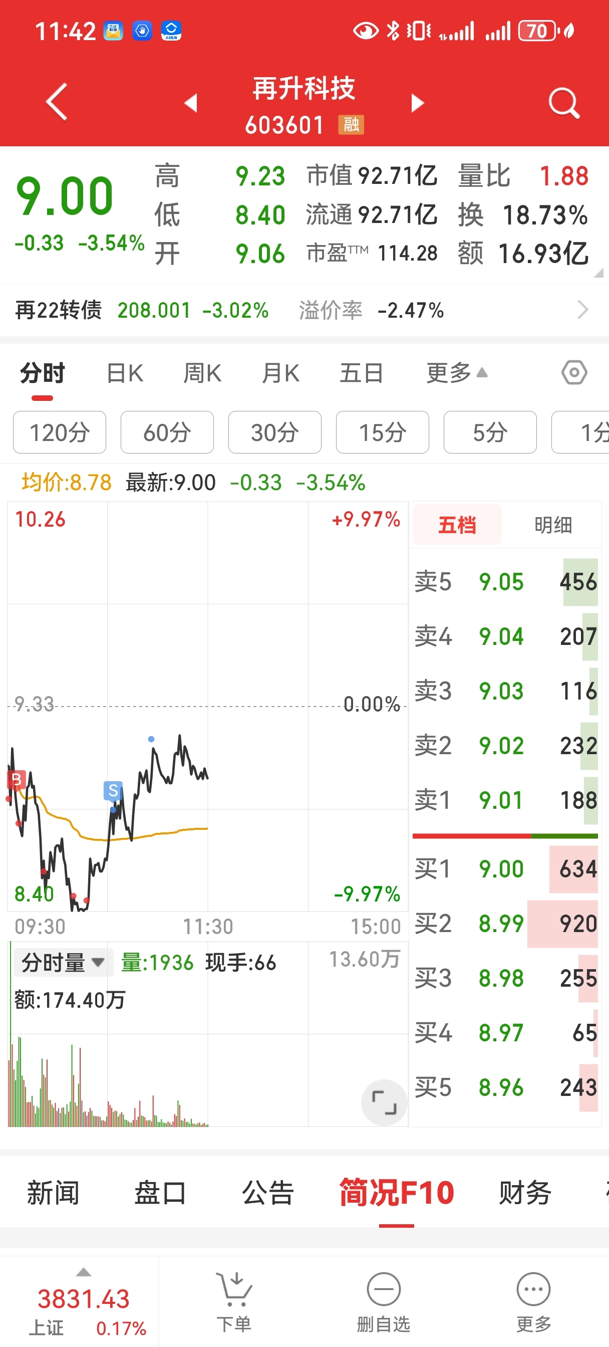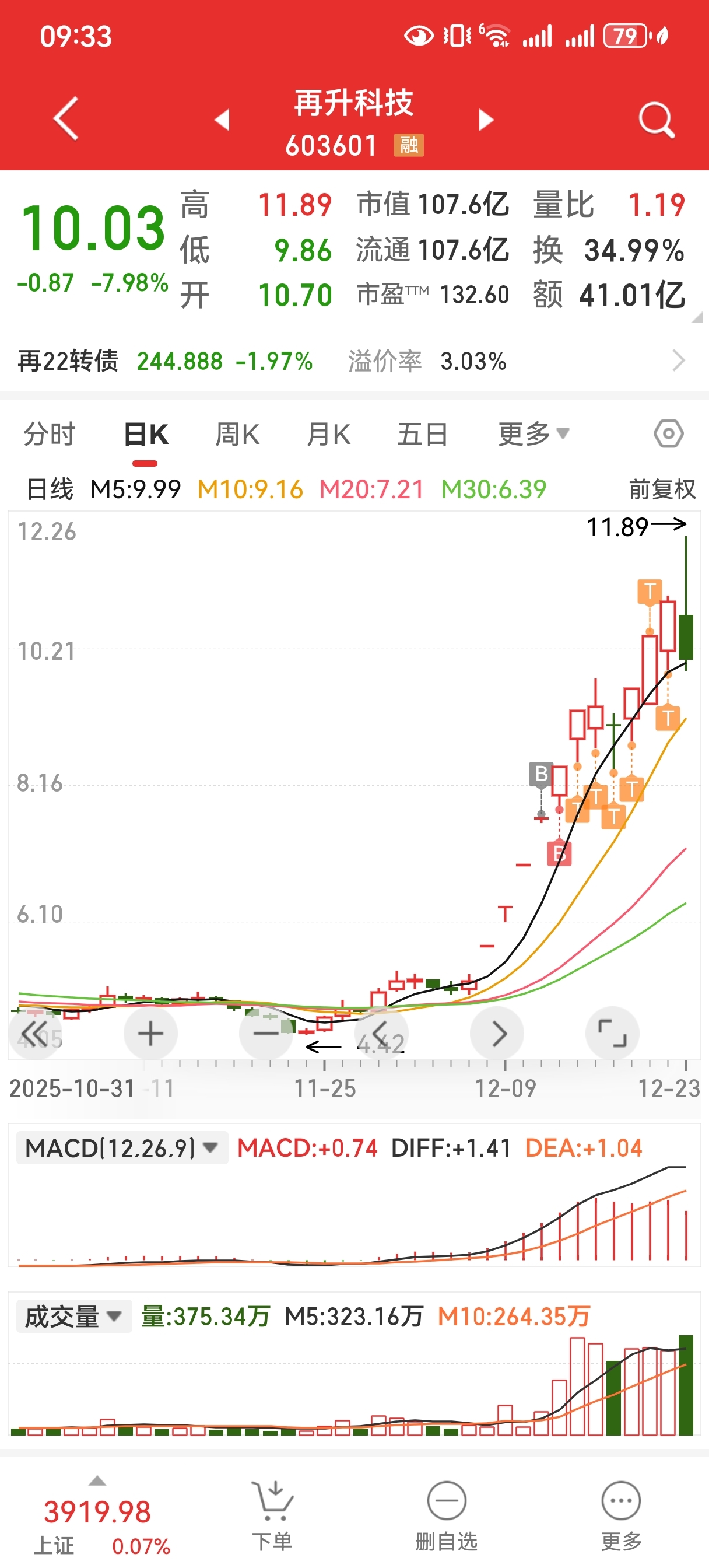 再升科技四板开始小仓买入,17号大跌分批买入四成仓位。今天分批出局,剩余一点点。