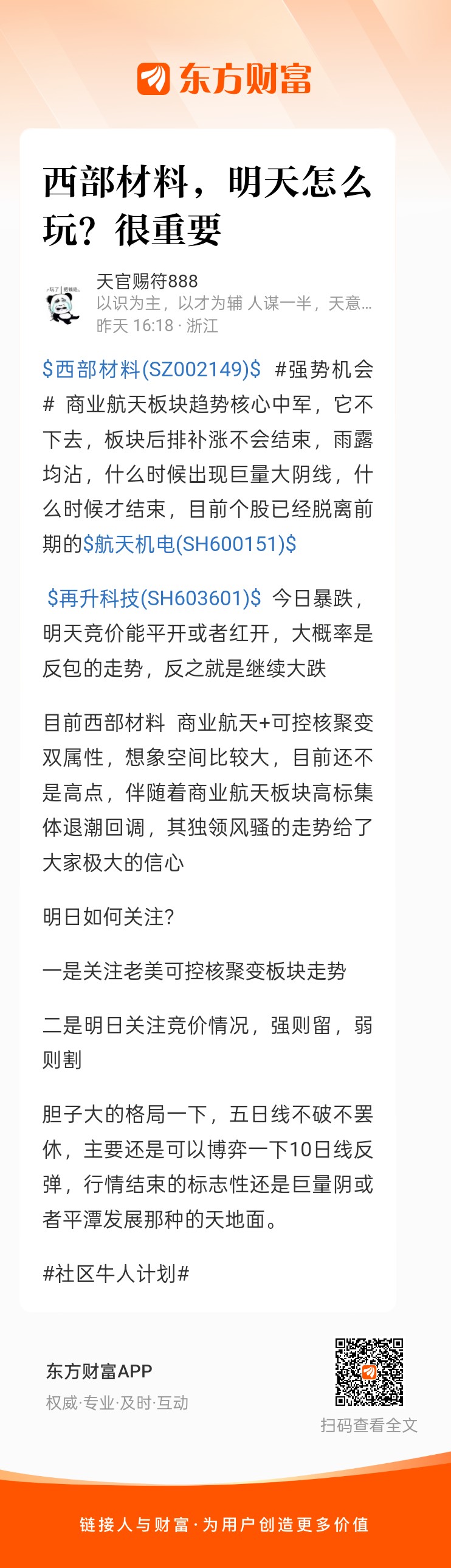 $西部材料(SZ002149)$ #强势机会# 商业航天板块趋势核心中军,它不下去,板块后排补涨不会结束,雨露均沾,什么时候出现巨量大阴线,什么时候才结束,目前个股已经脱离前期的$航天机电(SH600151)$