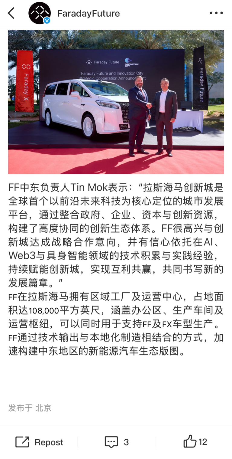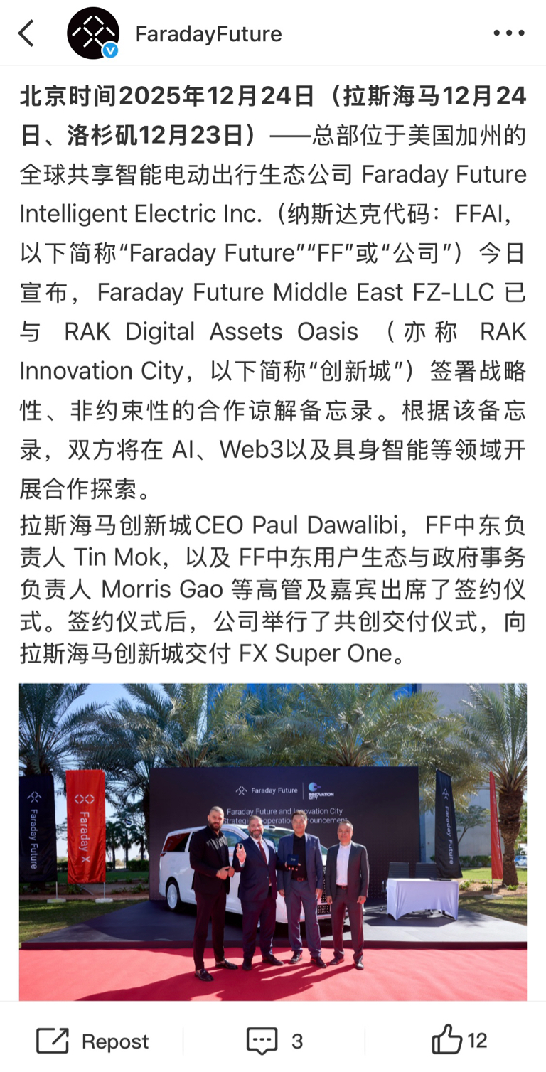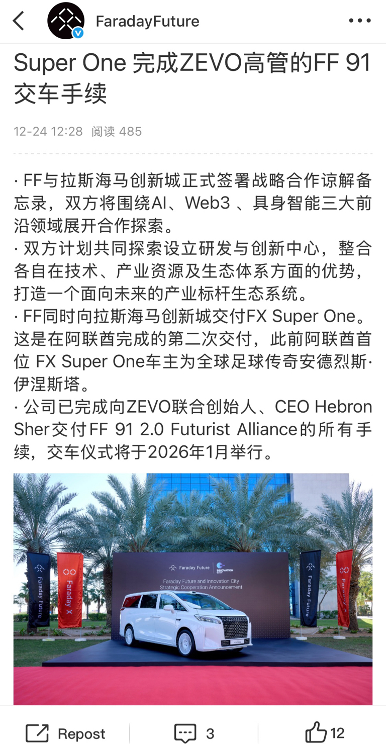 FF向拉斯海马创新城交付FX Super One, 完成ZEVO高管的FF 91交车手续。FF与拉斯海马创新城正式签署战略合作谅解备忘录,双方将围绕AI、Web3 、具身智能三大前沿领域展开合作探索。