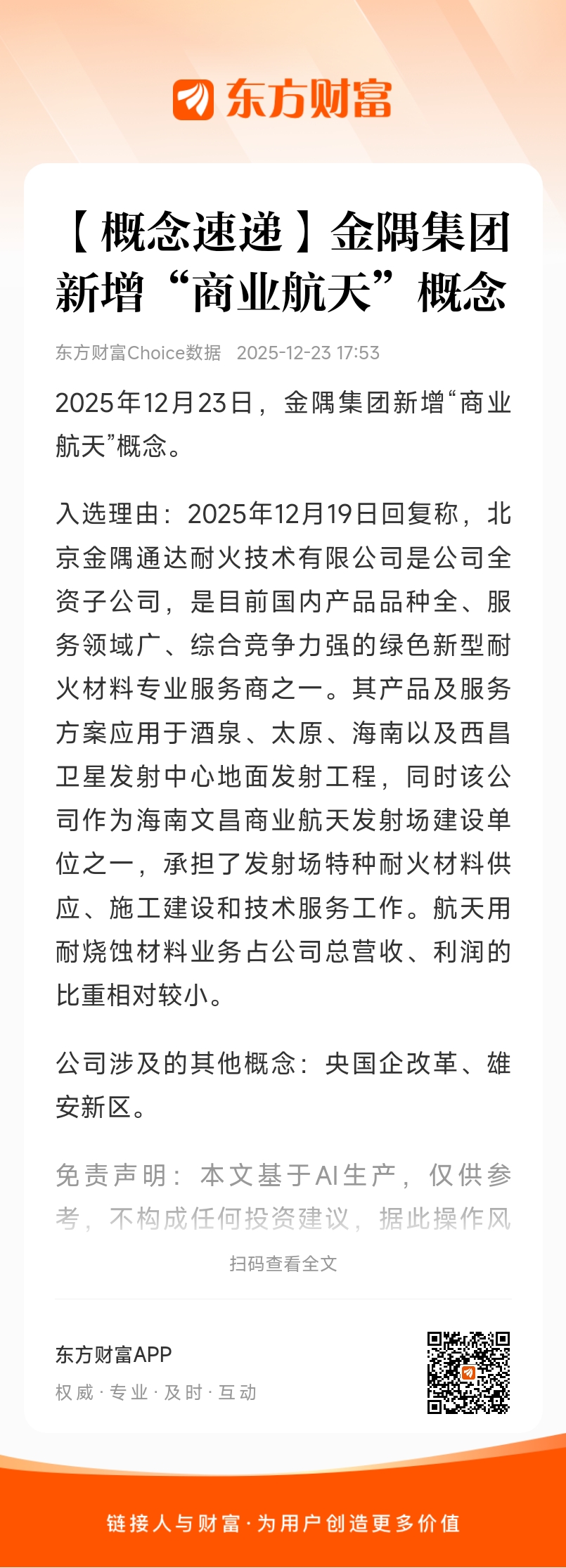 2025年12月23日,金隅集团新增“商业航天”概念。