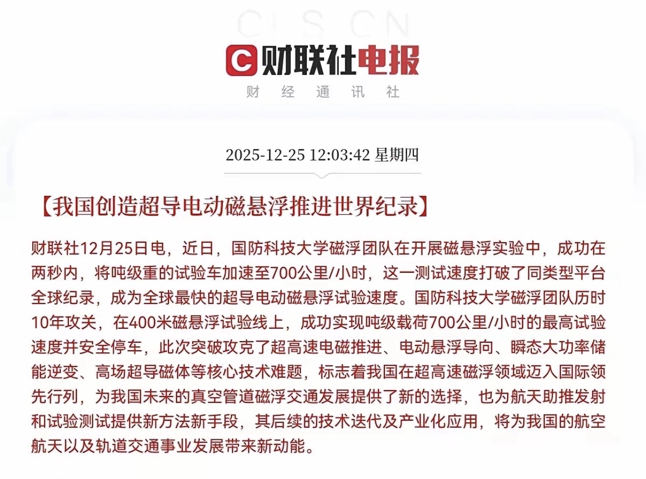 中午12.03分,财联社最新消息,国防科技大学磁浮团队取得重大突破,成功在两秒内,将吨级重的试验车加速至700公里/小时,这一测试速度打破了全球记录,成为全球最快的超导电动磁悬浮试验速度,这个消息对于超导概念是大利好消息,超导技术的突破体现了我国在超导磁浮领域的技术领先,太厉害了,每小时700公里,这速度堪比飞机的速度,远远快于当前高铁的速度,未来一定会大规模商业化,那么超导电动磁悬浮有望成为下一代超高速地面交通的核心技术,若未来与真空管道技术结合,可能实现更耗、更高速度的超高速铁路网,重塑交通格局,这又是一项伟大的突破,相关产业链公司将明显受益,值得期待!