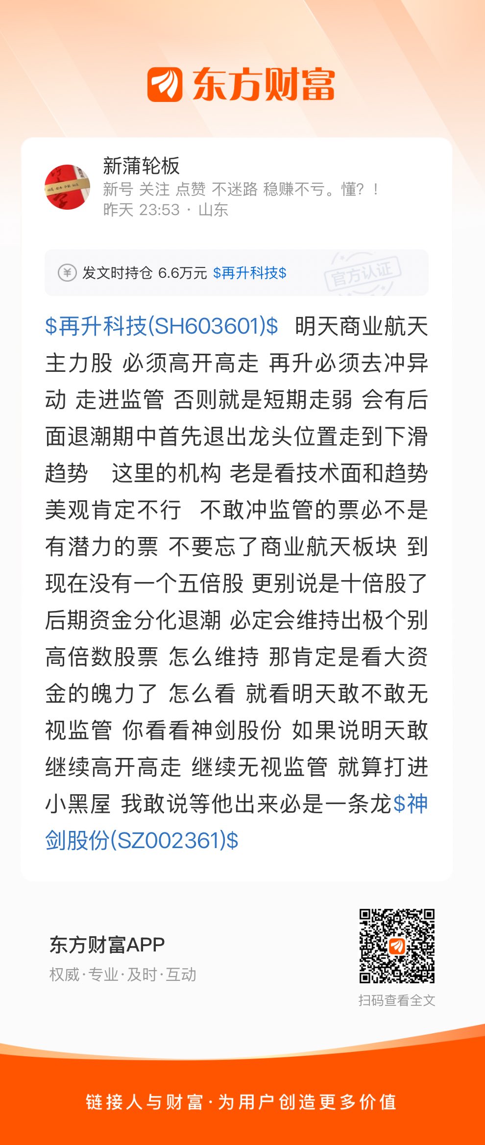 $再升科技(SH603601)$ 明天商业航天主力股 必须高开高走 再升必须去冲异动 走进监管 否则就是短期走弱 会有后面退潮期中首先退出龙头位置走到下滑趋势 这里的机构 老是看技术面和趋势美观肯定不行 不敢冲监管的票必不是有潜力的票 不要忘了商业航天板块 到现在没有一个五倍股 更别说是十倍股了 后期资金分化退潮 必定会维持出极个别高倍数股票 怎么维持 那肯定是看大资金的魄力了 怎么看 就看明天敢不敢无视监管 你看看神剑股份 如果说明天敢继续高开高走 继续无视监管 就算打进小黑屋 我敢说等他出来必是一条龙$神剑股份(SZ002361)$