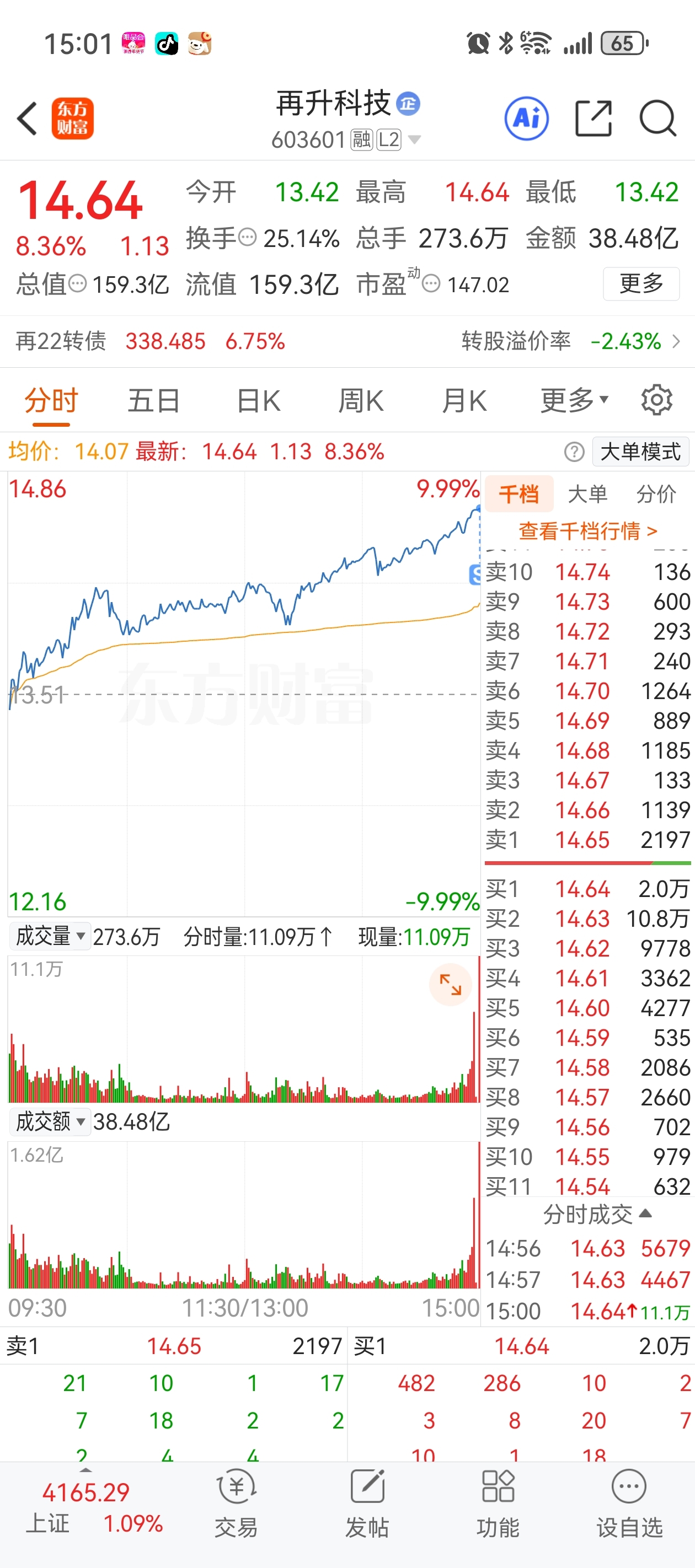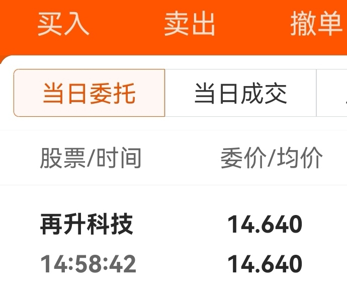 $再升科技(SH603601)$ 没压住啊!我挂的14.64成交了。抢筹的疯了,挂14.63多好,多好的股啊,现在大家都惨了。