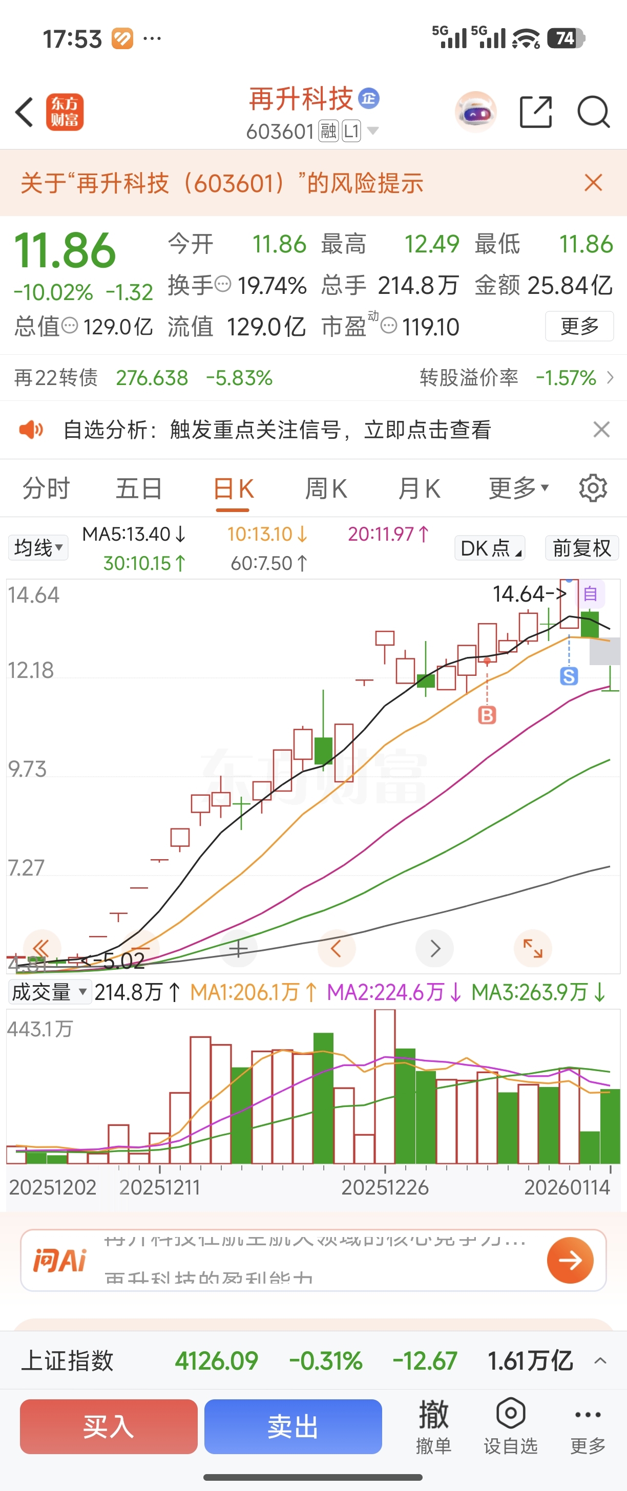 $再升科技(SH603601)$ 卖到最高点