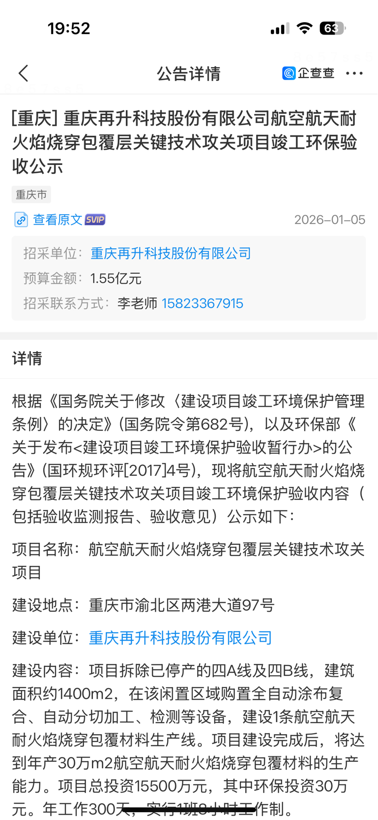 $再升科技(SH603601)$ 航空航天高端材料耐火焰烧穿包覆膜关键技术