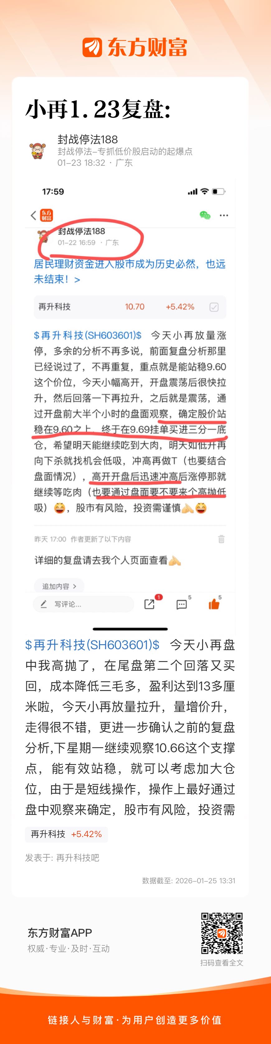 $再升科技(SH603601)$ 今天小再盘中我高抛了,在尾盘第二个回落又买回,成本降低三毛多,盈利达到13多厘米啦,今天小再放量拉升,量增价升,走得很不错,更进一步确认之前的复盘分析,下星期一继续观察10.66这个支撑点,能有效站稳,就可以考虑加大仓位,由于是短线操作,操作上最好通过盘中观察来确定,股市有风险,投资需谨慎