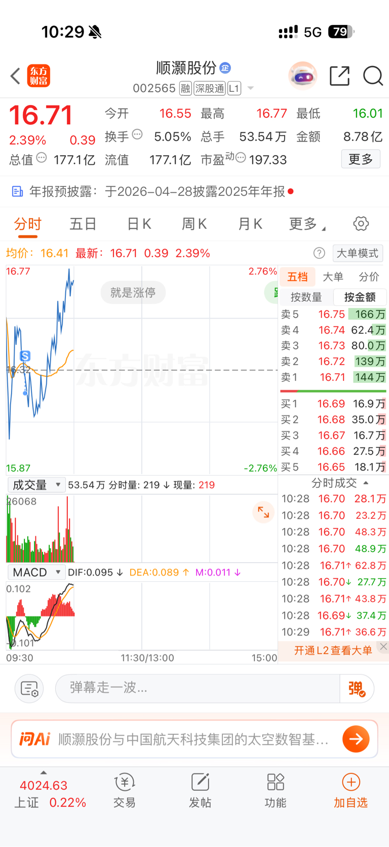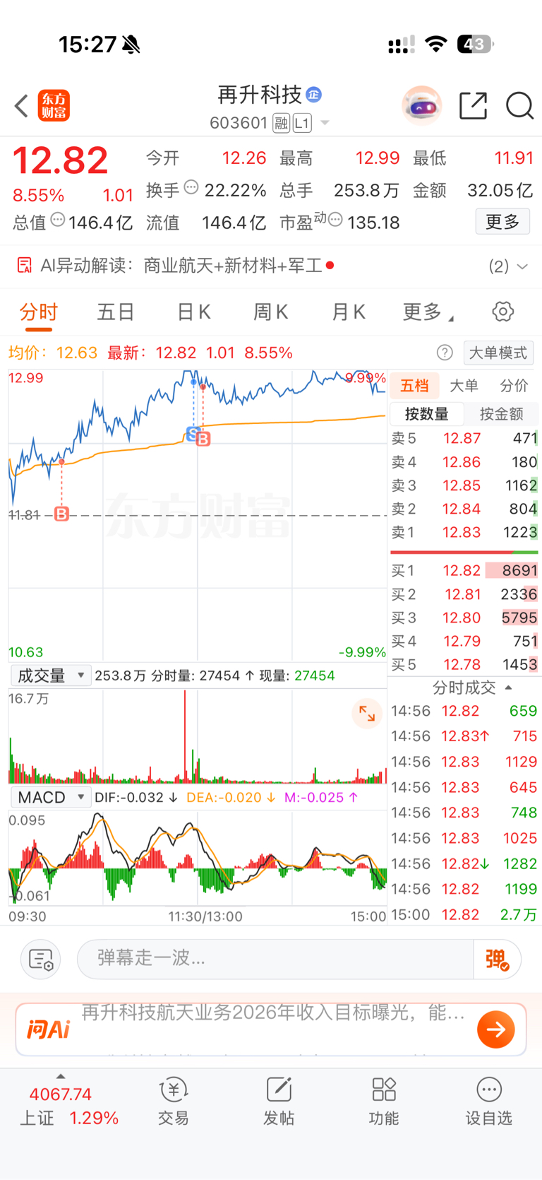 $再升科技(SH603601)$ 今天不知道操作的对不对,顺灏清仓了,然后加仓再升,从航天大跌持有四个票,到割肉调仓最后只有再升了,从总盈利两万到回调四万再到盈利一万,是再升的功劳,也不晓得拿到年前能不能到心理价位