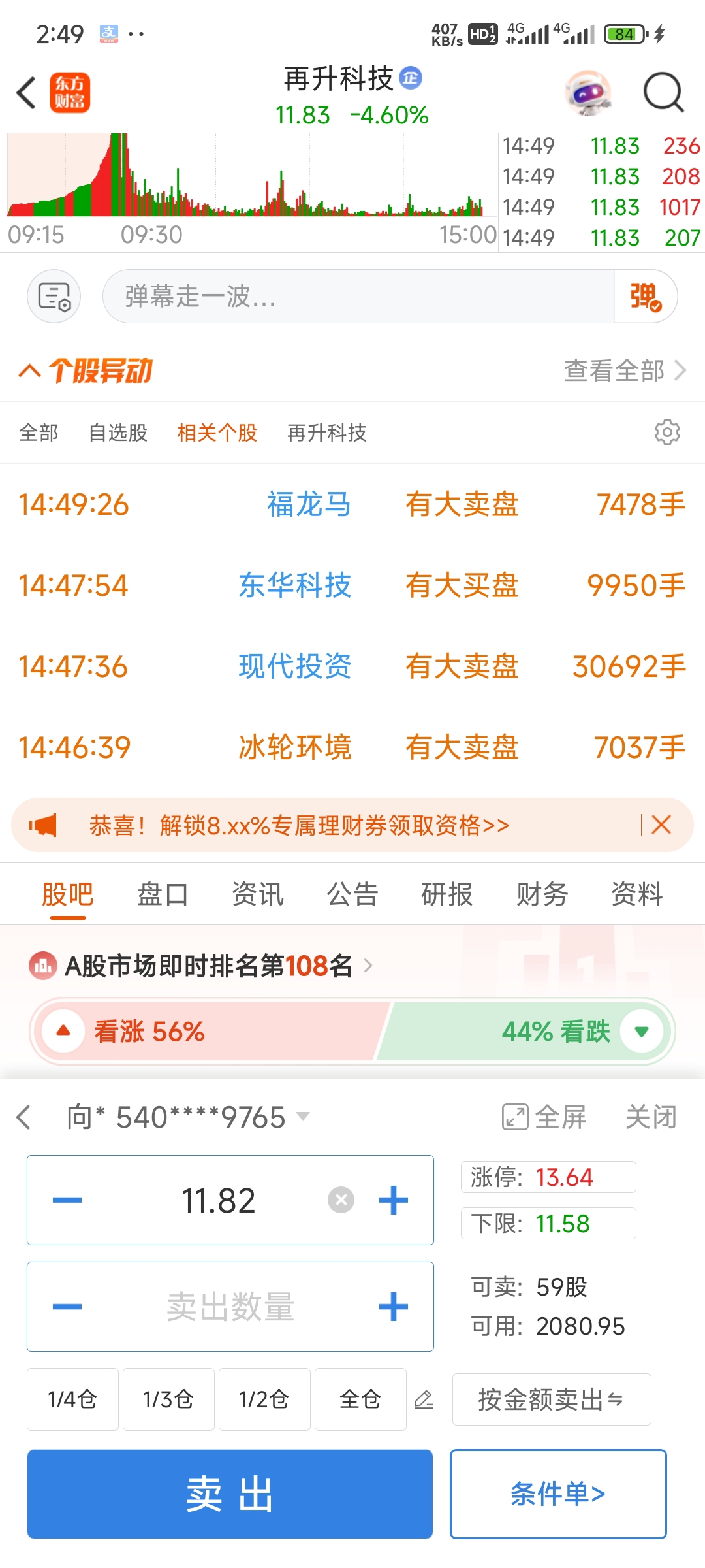 $再升科技(SH603601)$ 领导们,帮忙解释下这是什么原因,59手卖不出去?