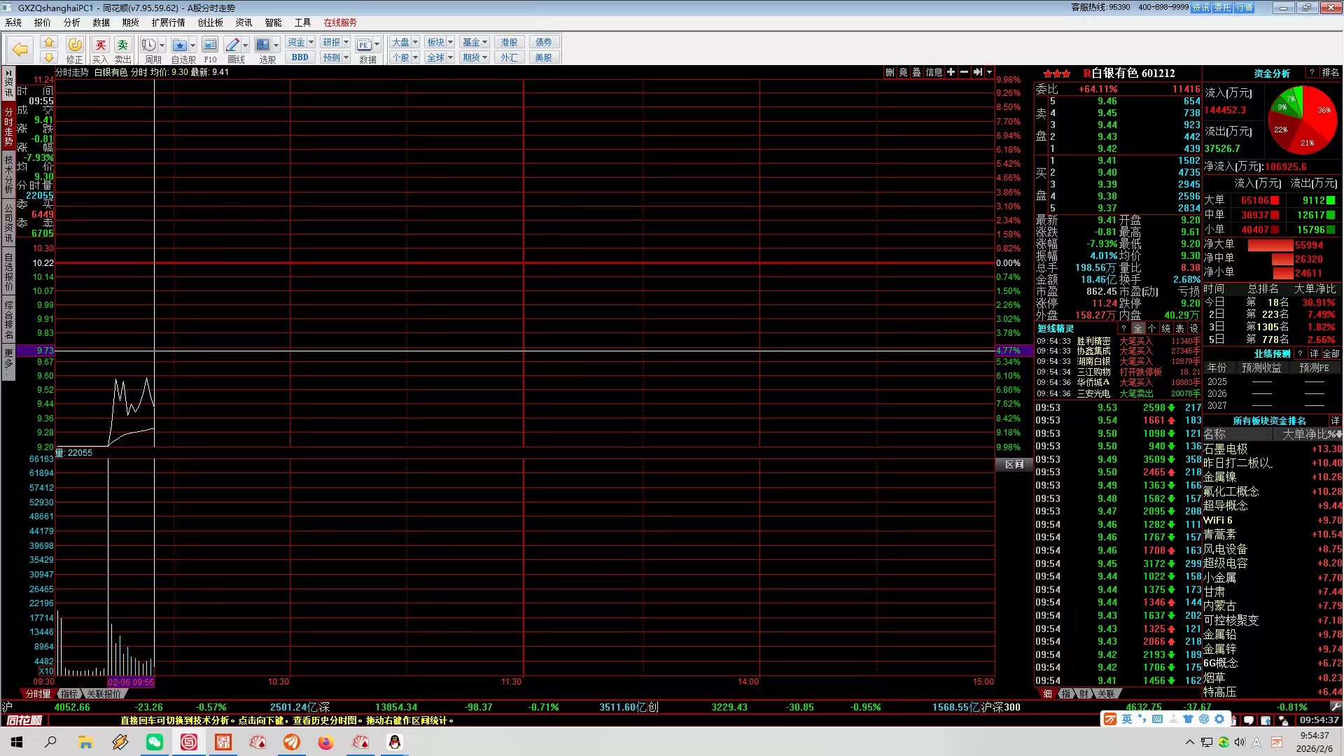行情转暖,继开盘雨朦胧在9.39元吃入白银有色为国护盘以后,当时接了图的,9.4