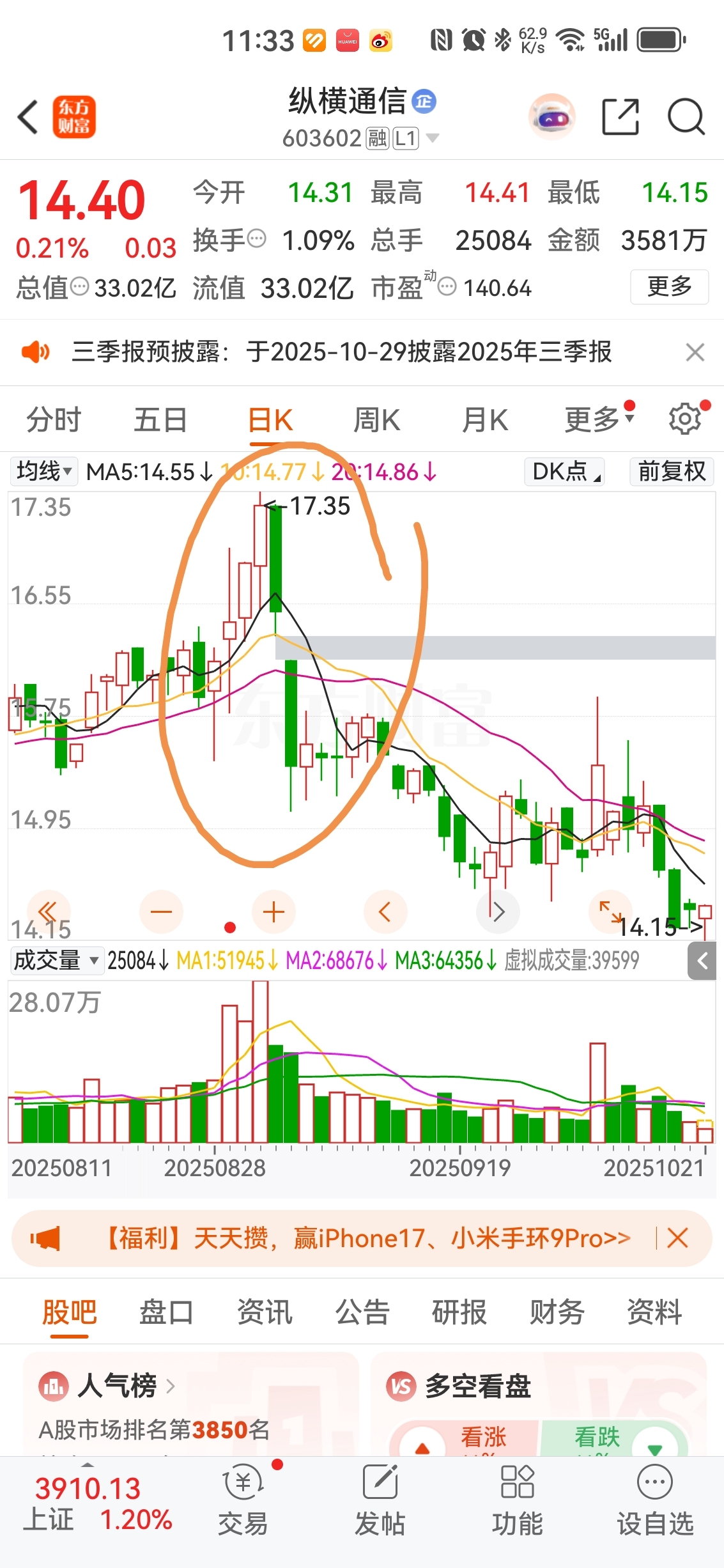 $纵横通信(SH603602)$ 这两根带缺口阴线的下杀,表明短期内不会有行情,不管大盘怎么涨都与它无关了发布于纵横通信吧