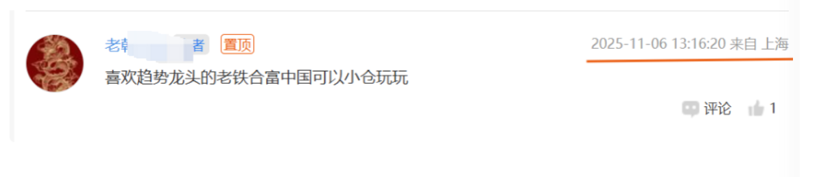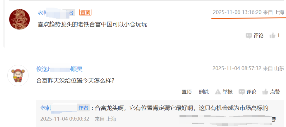 完美的一天啊,早上开盘直接就封板了,盘中炸板一次也没怎么放量,还吓跑不少散户。现在回头来看,早点关注老韩跟着一起薅这只标,而且到今天都跟着老韩格局,70个点大肉,11月开头的超级大肉啊,提前把年底的目标都完成了。当然有错过的老铁也别太伤心,错过这个咱们去薅下一个也一样的,比如今天四只涨停,随便薅任何一直都是肉啊,现在开始一定要关注好老韩了,再错过可得不偿失。$合富中国(SH603122)$