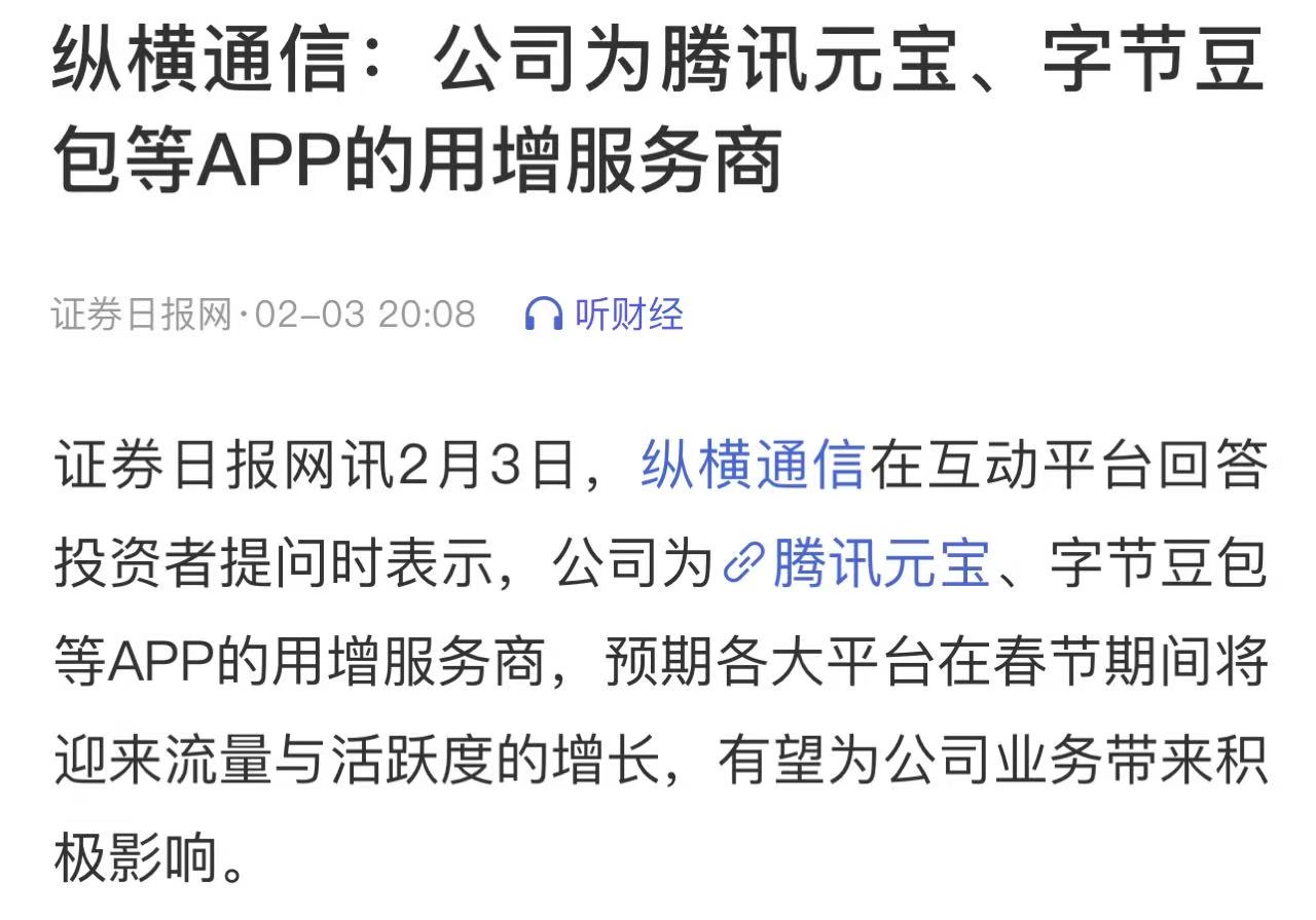 $纵横通信(SH603602)$ 作为腾讯元宝、字节豆包等头部AI应用的官方用户增长服务商,同时服务红果短剧、番茄小说等内容平台,将直接受益于春节期间AI应用和内容平台的流量爆发。属于AI产业链中的“铲子股”(类比于先导智能之于固态电池),不直接参与AI应用的研发,而是通过用户增长服务分享AI应用商业化红利,Q1业绩预期大,中线更是看好。
