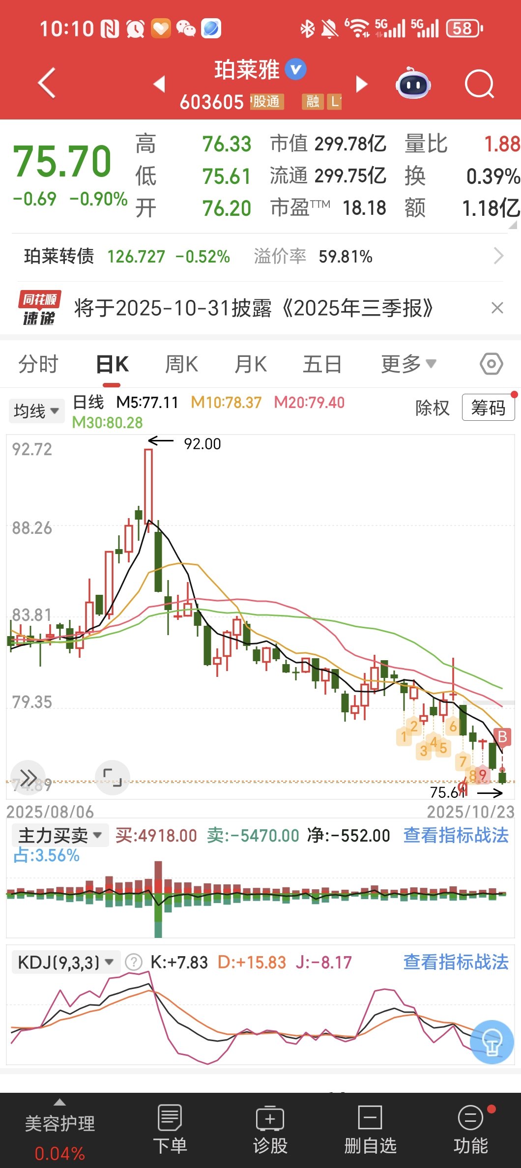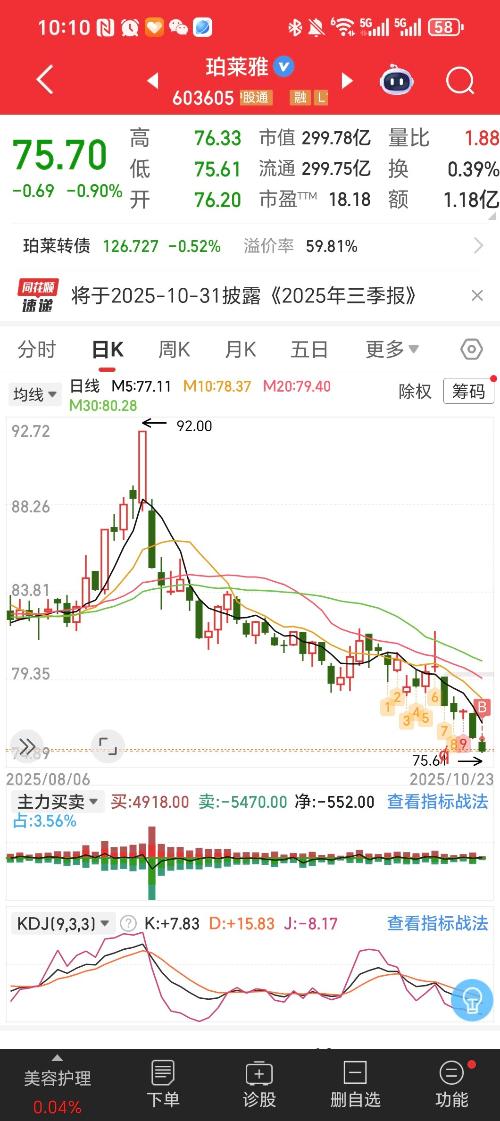 $珀莱雅(SH603605)$  缺口在76 77块我就建仓