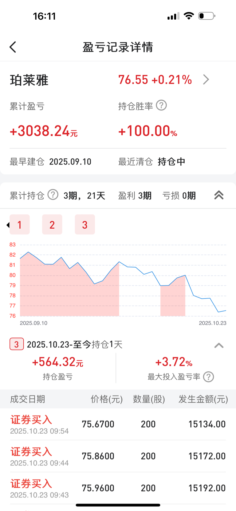 $珀莱雅(SH603605)$ 这是我最小的仓位,81.55开始拿的,一个多月了,天天阴跌,每次买个几百股,拉起来就跑