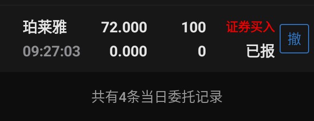 $珀莱雅(SH603605)$ 早上9点27挂的72为啥没成交呢?最低到71.9了都没成交,这个票已经两次这样了。这个点了我才知道没成交,啥意思,内幕吗?