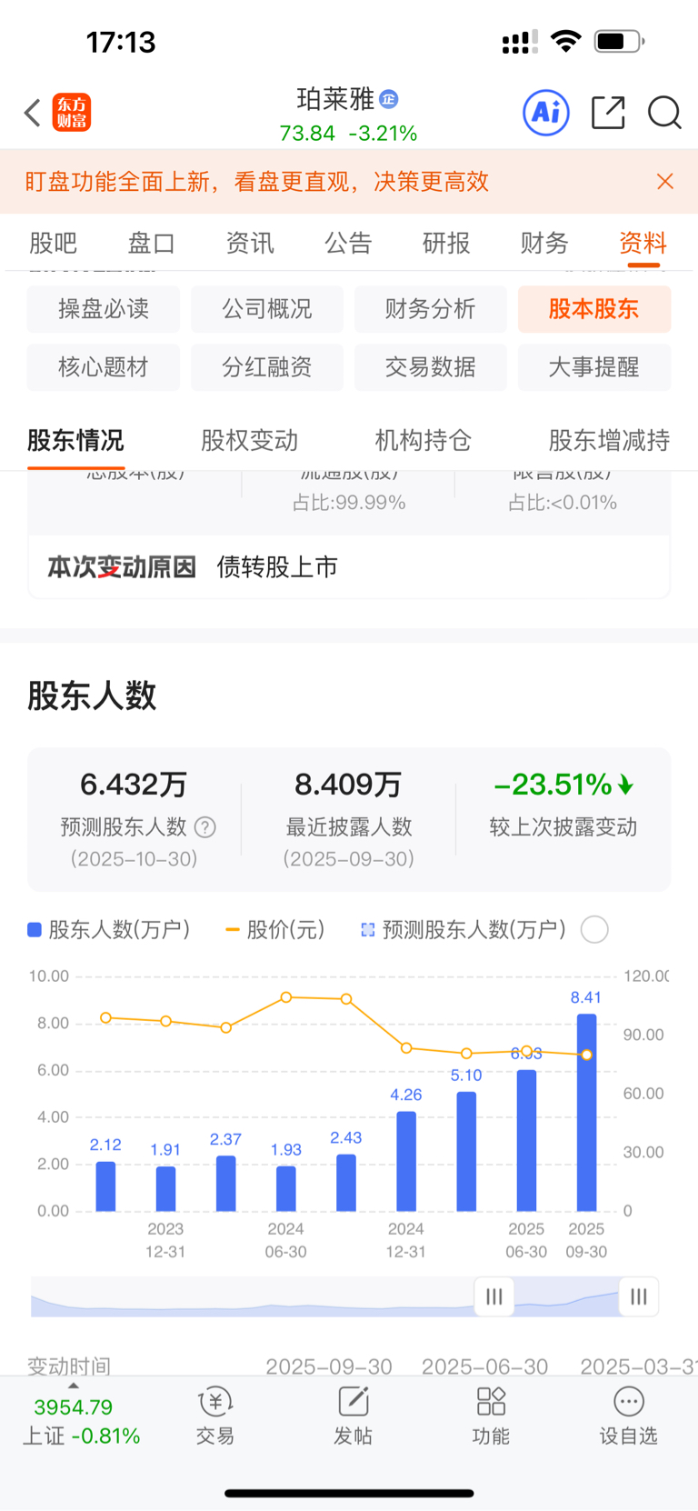 $珀莱雅(SH603605)$ 自己看看散户股东增加多少,一年多散户股东涨了4倍。大家都以为低位了,结果发现还在半山腰。