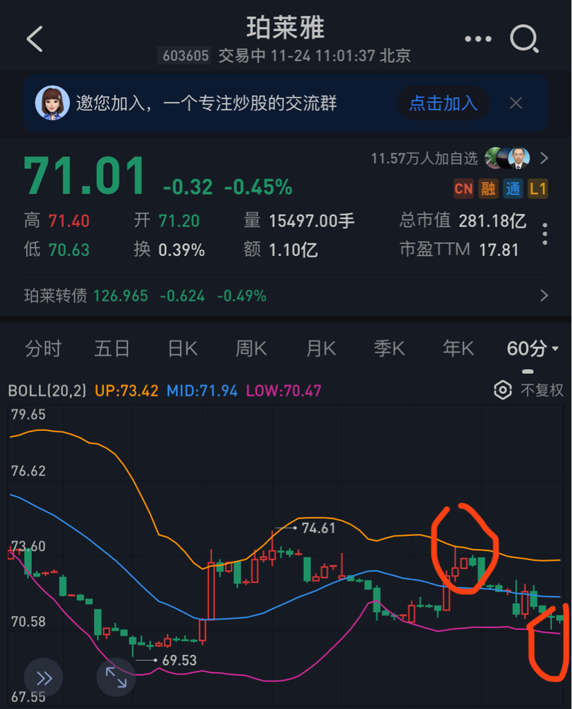 $珀莱雅(SH603605)$ 一根上影线触顶,一根长下影线探底,反转信号。