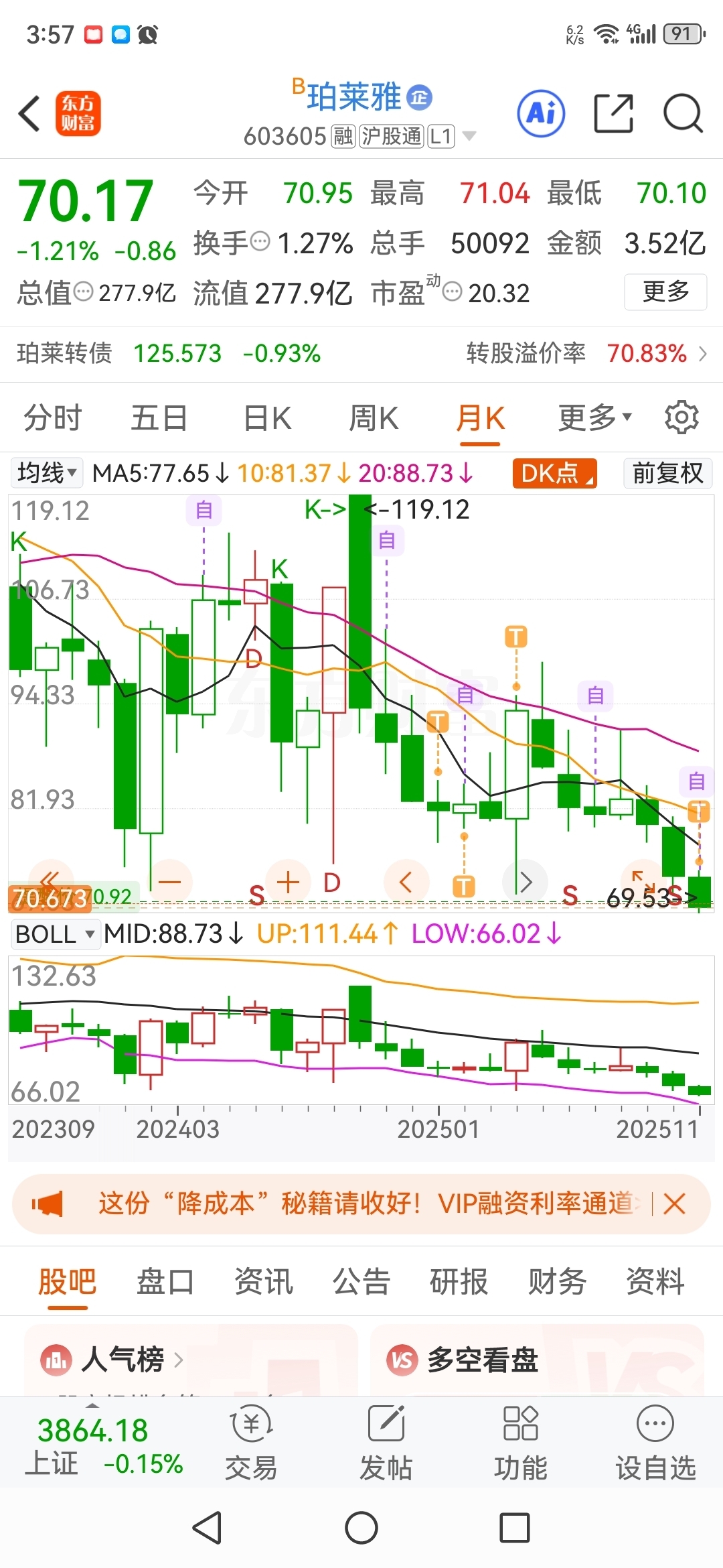 $珀莱雅(SH603605)$ 看月B0LL线,若明天下跌6元每股,则本月遇下BOLL线,若本月不遇则下月更低,所以兄弟们还赌不?