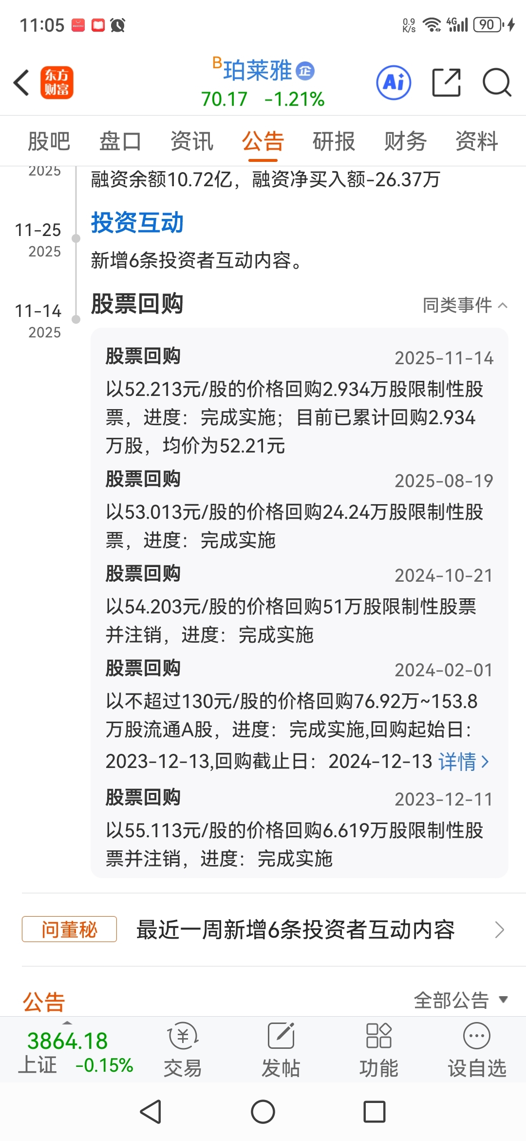 $珀莱雅(SH603605)$ 今年8月份回购限售股,股价大涨。11月份回购限售股,股价却大跌?