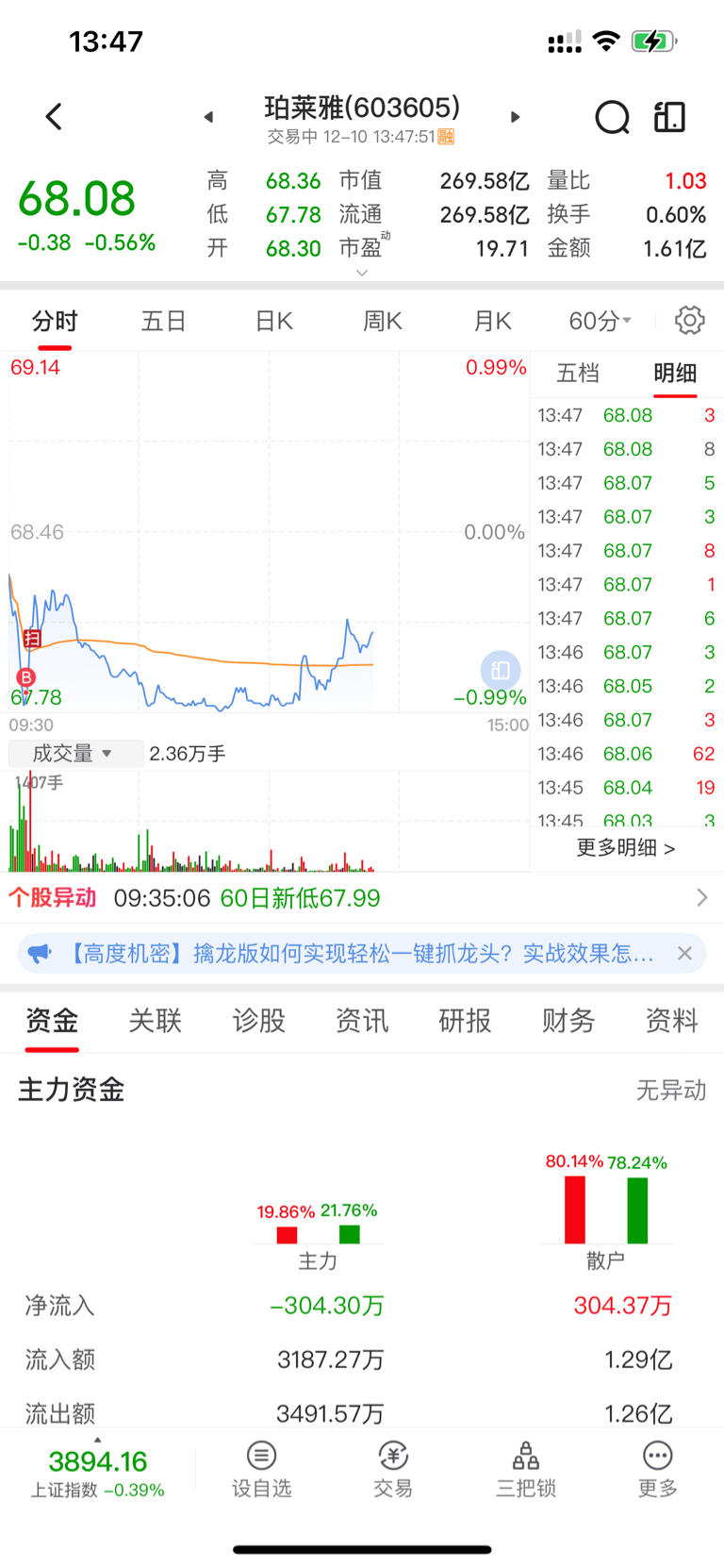 $珀莱雅(SH603605)$ 昨天69.5清仓今天接回还有谁