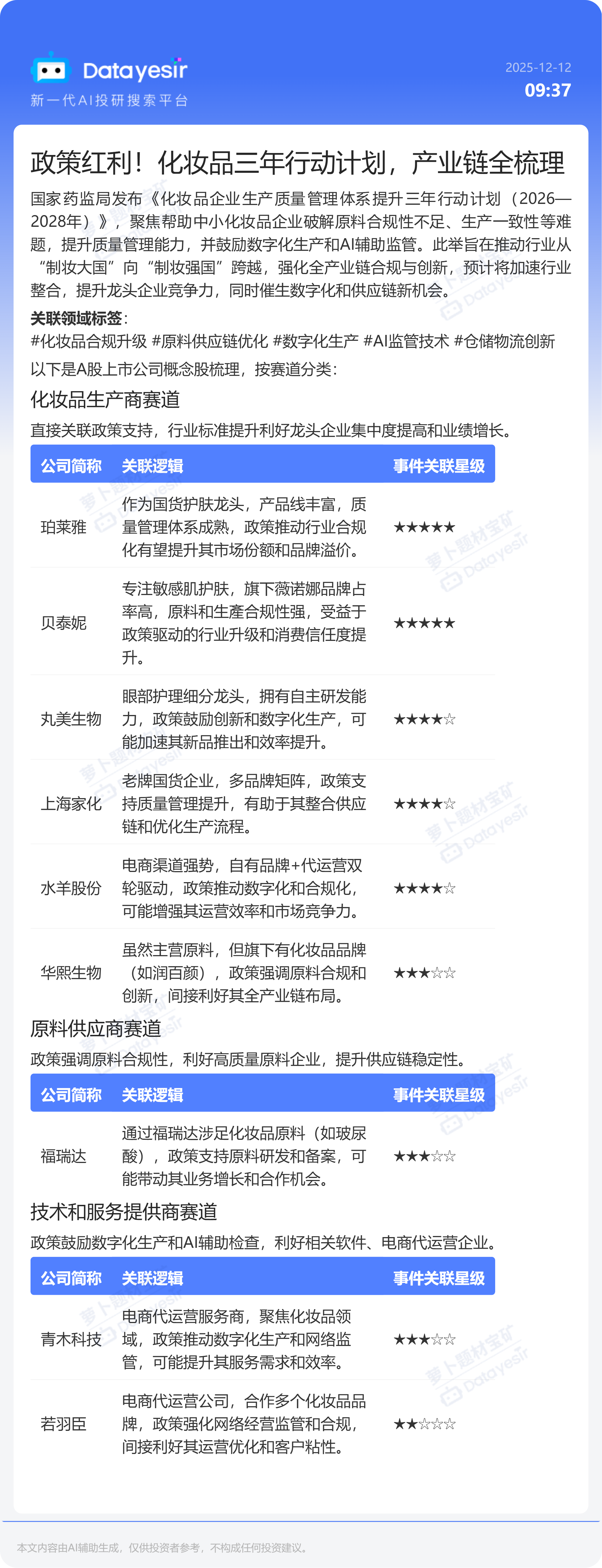 国家药监局发布《化妆品企业生产质量管理体系提升三年行动计划(2026—2028年)》,聚焦帮助中小化妆品企业破解原料合规性不足、生产一致性等难题,提升质量管理能力,并鼓励数字化生产和AI辅助监管。