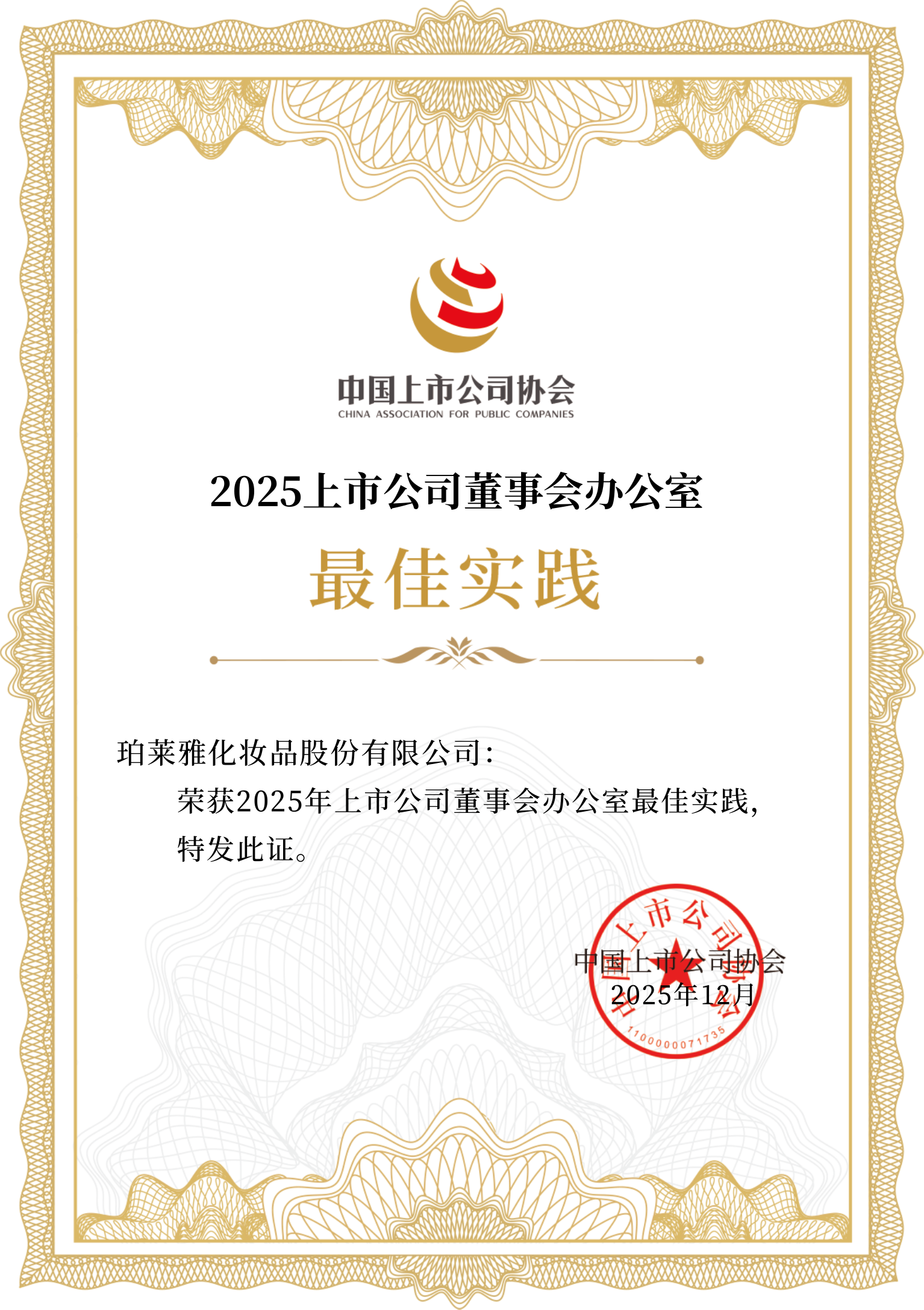 Recently, the China Association for Public Companies (CAPCO) announced the results of the “Best Practice of Board Office of Listed Companies 2025” selection, which includes two categories: “Best Practice” and “Excellent Practice.” Proya Cosmetics Co., Ltd. (603605.SH) was successfully awarded the highest distinction, “Best Practice,” in recognition of its Board Office’s systematic governance innovation and outstanding overall performance.