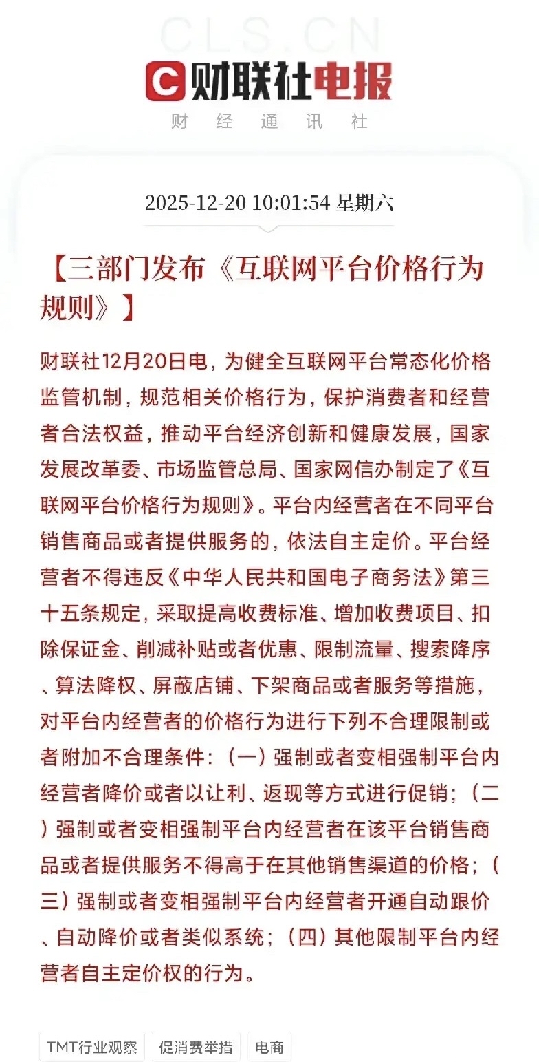 刚刚,国家发改委、市场监管总局、国家网信办三部门联合发布,《互联网平台价格行为规则》,为平台经济的价格行为,划定了清晰的红线和底线。这份文件,将深刻改变平台、商家和消费者三方关系,标志着平台经济监管,进入精细化、常态化的新阶段。