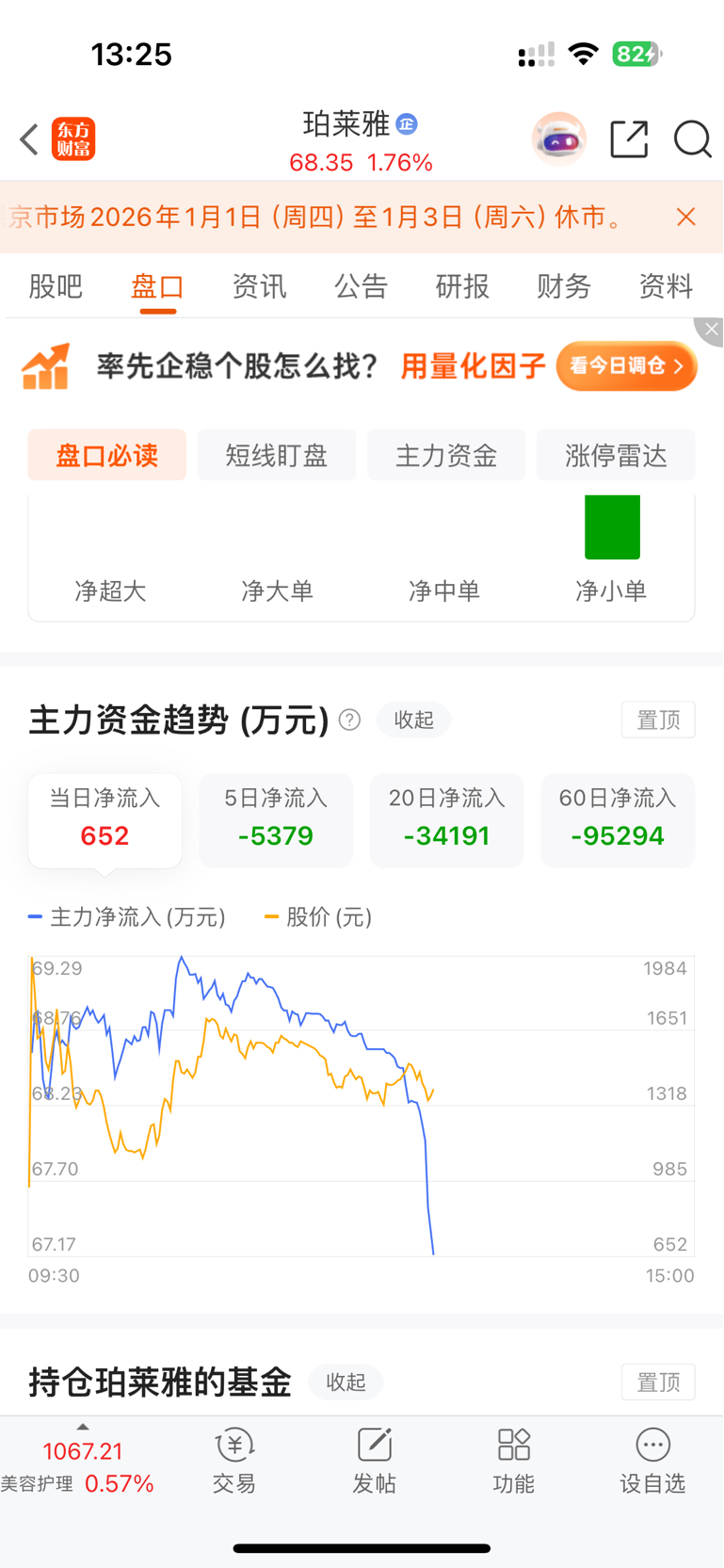 $珀莱雅(SH603605)$ 厉害,又是一根直线往下砸盘,其他的都上去了,就它下来了,真是废啊,