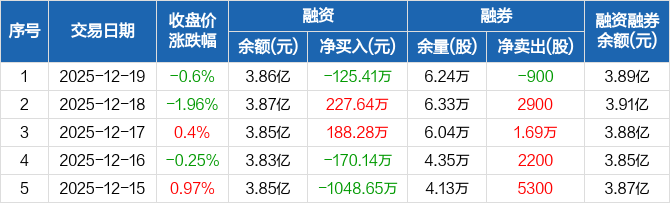 东方电缆:融资净偿还125.41万元,融资余额3.86亿元(12-19)