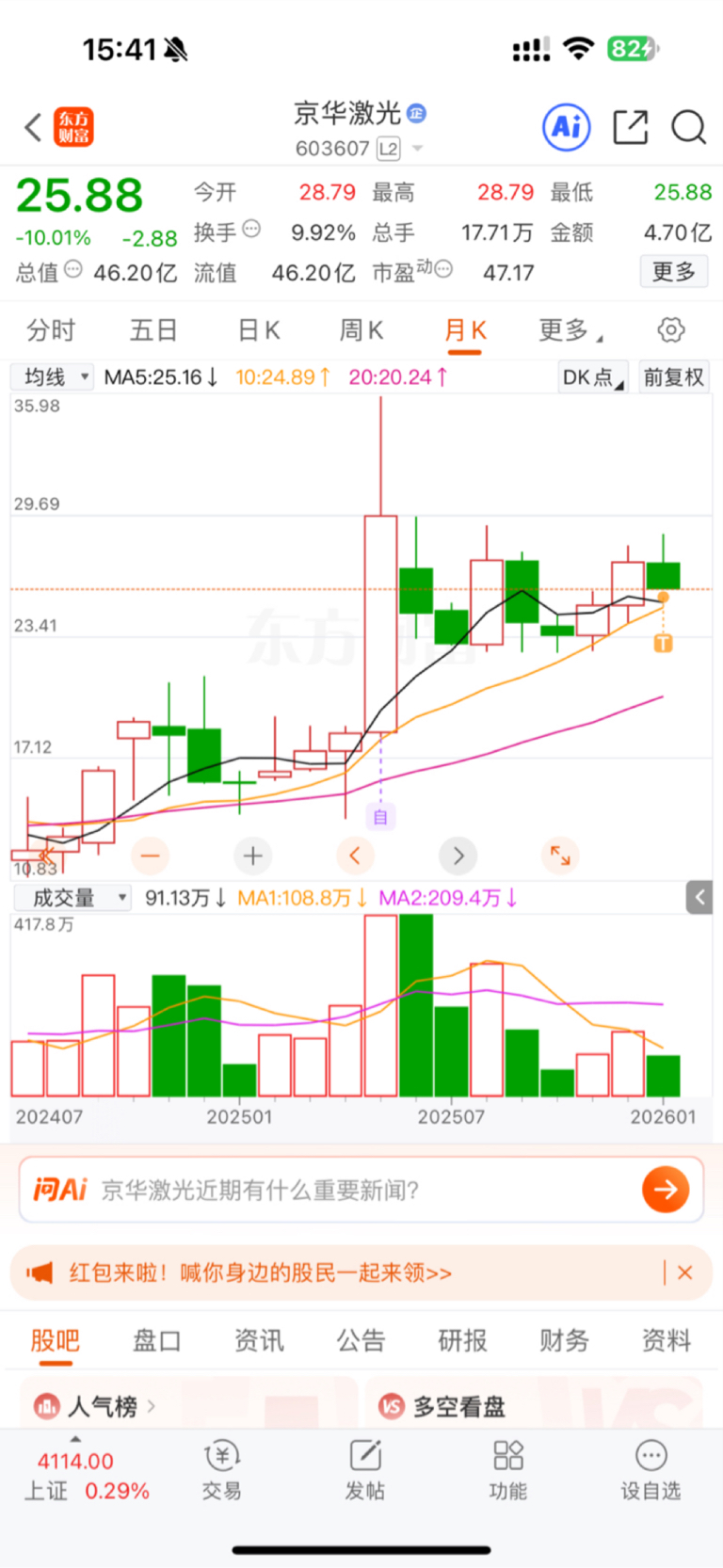 $京华激光(SH603607)$ 四季度业绩没出来,看往年表现,四季度最强,大概率年报业绩依旧增长,例外按照同花顺的跌停异动解读,涨太多+减持,这不纯扯淡吗,横盘八个月箱体震荡,另外减持是25年底的事,哪怕就是今天减持总数不到3000手,一个跌停?怕不是庄为了筹码不要B脸