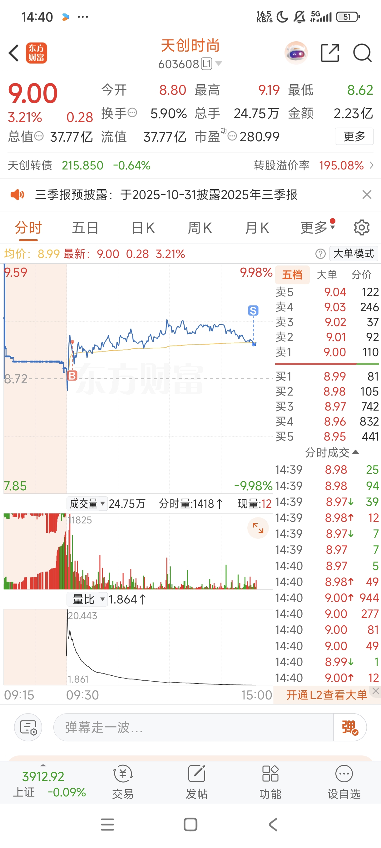 $天创时尚(SH603608)$ 机智的我赶紧把今天买的卖了