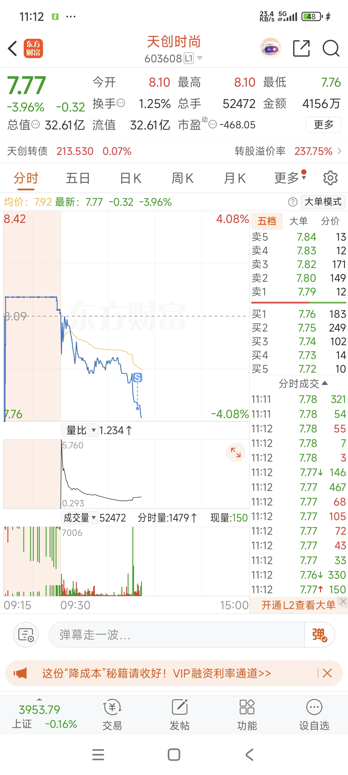 $天创时尚(SH603608)$ 每天割肉,奶奶的