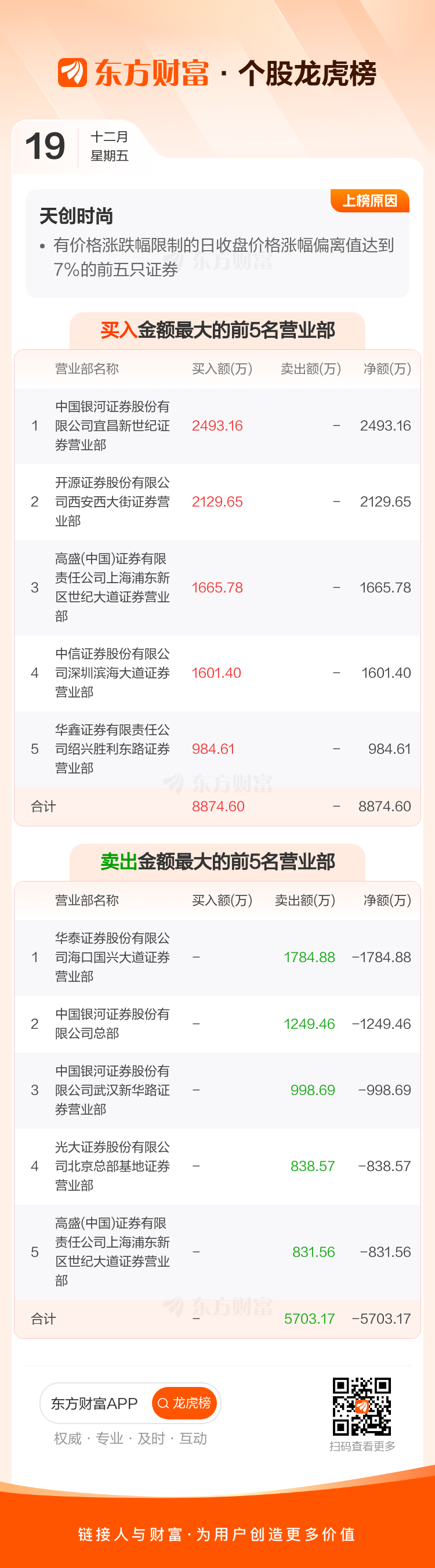 交易所2025年12月19日公布的交易公开信息显示,天创时尚因成为有价格涨跌幅限制的日收盘价格涨幅偏离值达到7%的前五只证券上榜。天创时尚当日收报8.33元,涨跌幅10.04%,偏离值9.68%,换手率11.58%,成交额4.01亿。