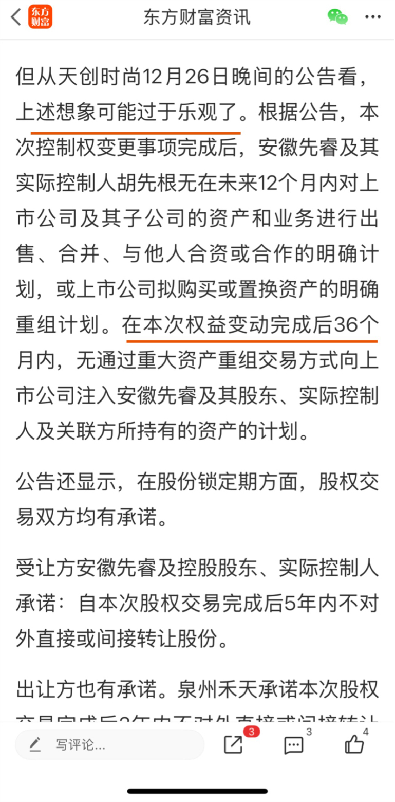 $天创时尚(SH603608)$ 人家已经说了,未来36个月不重组,所以不要再做梦了,人家天普、锋龙有故事讲,没有故事的会变成事故