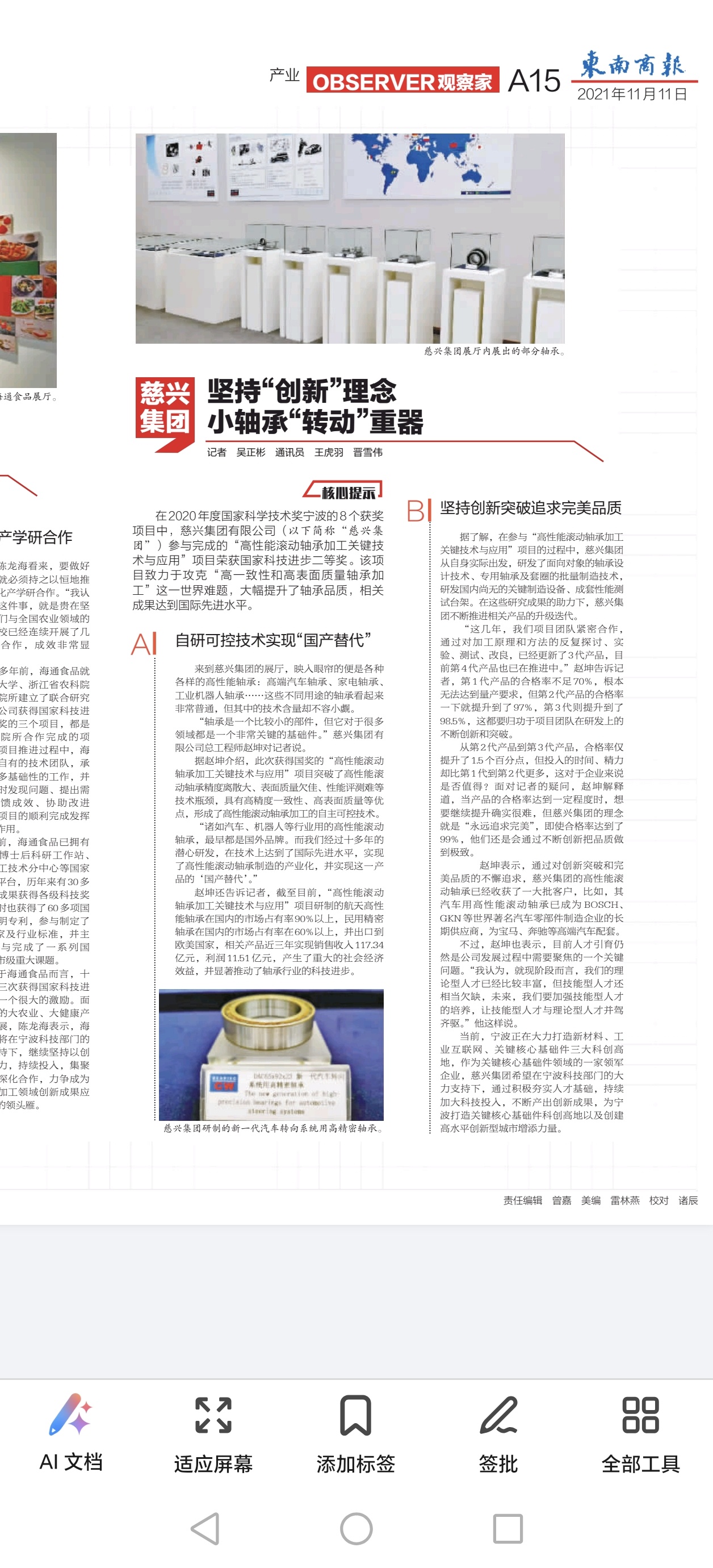 东南商报2021年发布:截至目前,“高性能滚动轴承加工关键技术与应用”项目研制的航天高性能轴承在国内的市场占有率90%以上,民用精密轴承在国内的市场占有率在60%以上,并出口到欧美国家。