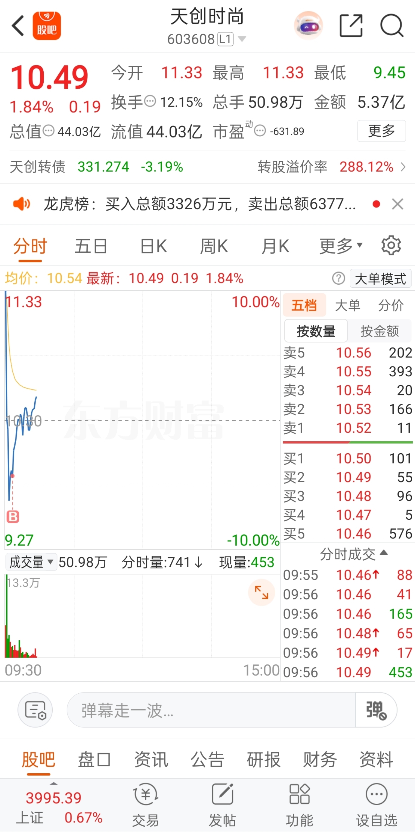 早盘选择水下低吸介入了个股$天创时尚(SH603608)$