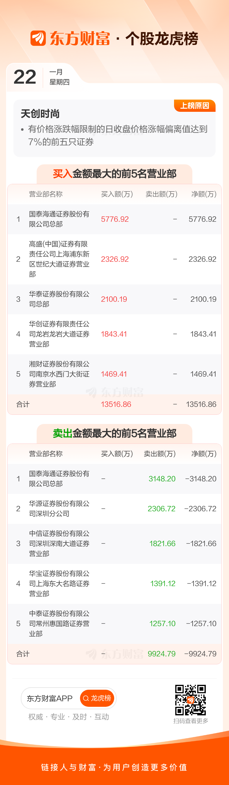 交易所2026年1月22日公布的交易公开信息显示,天创时尚因成为有价格涨跌幅限制的日收盘价格涨幅偏离值达到7%的前五只证券、非ST、*ST和S证券连续三个交易日内收盘价格涨幅偏离值累计达到20%的证券上榜。天创时尚当日收报12.05元,涨跌幅10.05%,偏离值9.91%,换手率16.45%,成交额8.05亿。异常期间1月21日至1月22日,期间涨幅21.11%,累计偏离值20.89%,区间成交额9.75亿。