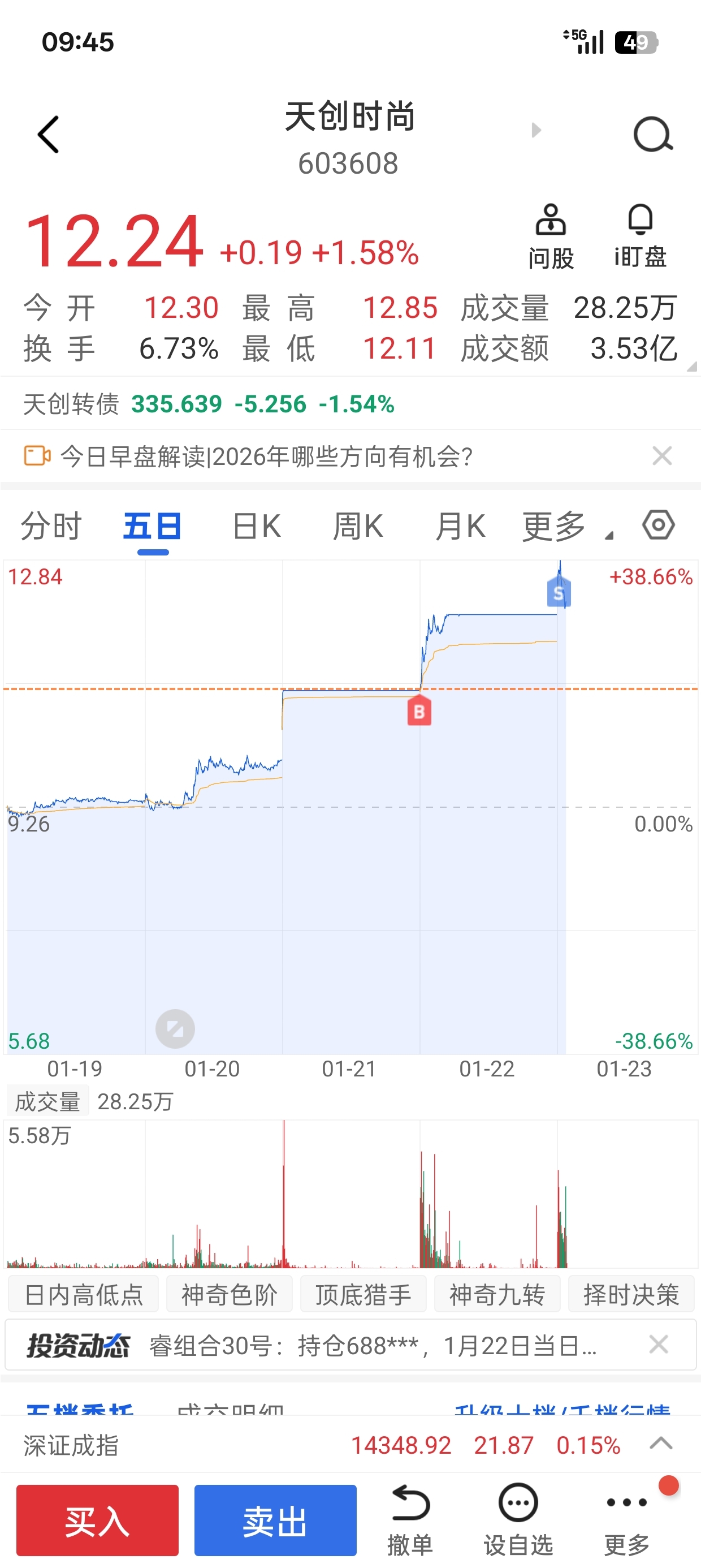 $天创时尚(SH603608)$ 走了走了15个点不贪,找下一个目标