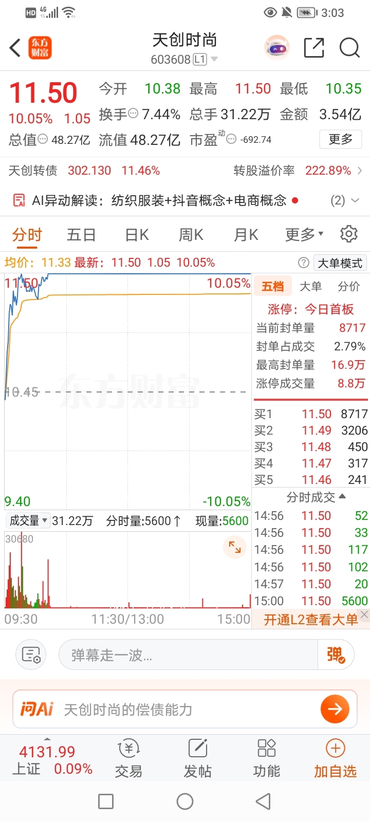 $天创时尚(SH603608)$ 这是尾盘撤单了吗?