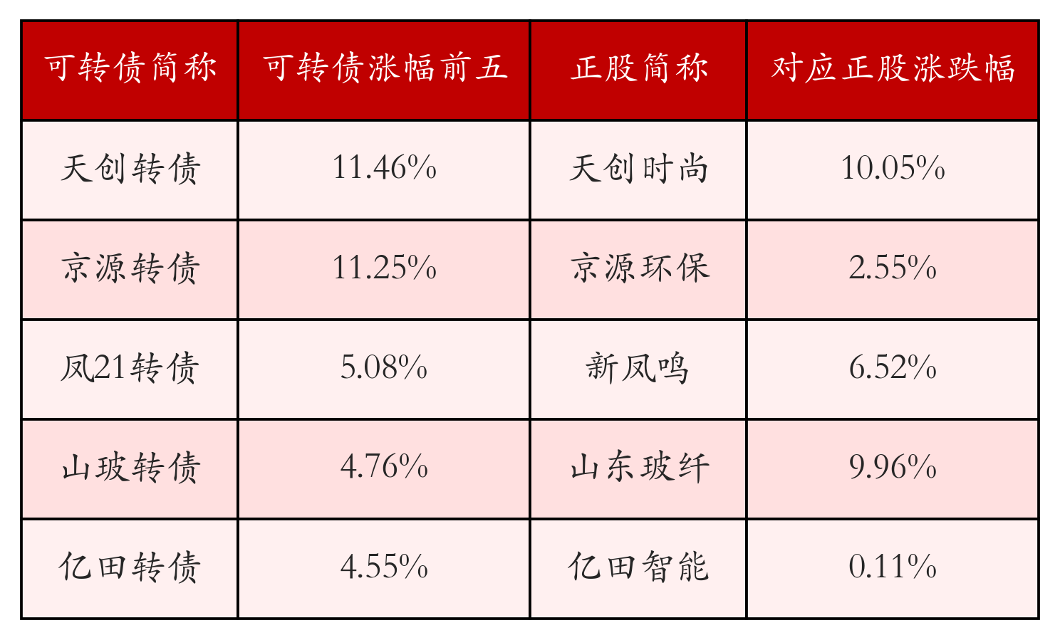 南财智讯2月11日电,盘后数据显示,债市方面,中证转债指数收涨0.05%,报526.36,成交额为707.19亿元。可转债方面,今日共成交370只可转债,其中215只收涨,0只收平,155只收跌。具体来看,29只可转债涨幅超过2%。其中天创转债(113589)涨11.46%,京源转债(118016)涨11.25%,凤21转债(113623)涨5.08%。今日有30只可转债跌幅超2%,安集转债(118054)跌8.88%,永吉转债(113646)跌8.71%,嘉泽转债(113039)跌6.78%。存在交易量的可转债所对应的正股中,172只收涨,12只收平,186只收跌。具体来看,11只可转债对应正股涨幅超过5%,其中,天创时尚(603608)涨停,收涨10.05%;百川股份(002455)涨停,收涨10.01%。同时所对应的可转债:天创转债(113589)同涨11.46%;百川转2(127075)同涨3.73%。今日有5只可转债对应正股跌幅超过5%,没有正股跌停。