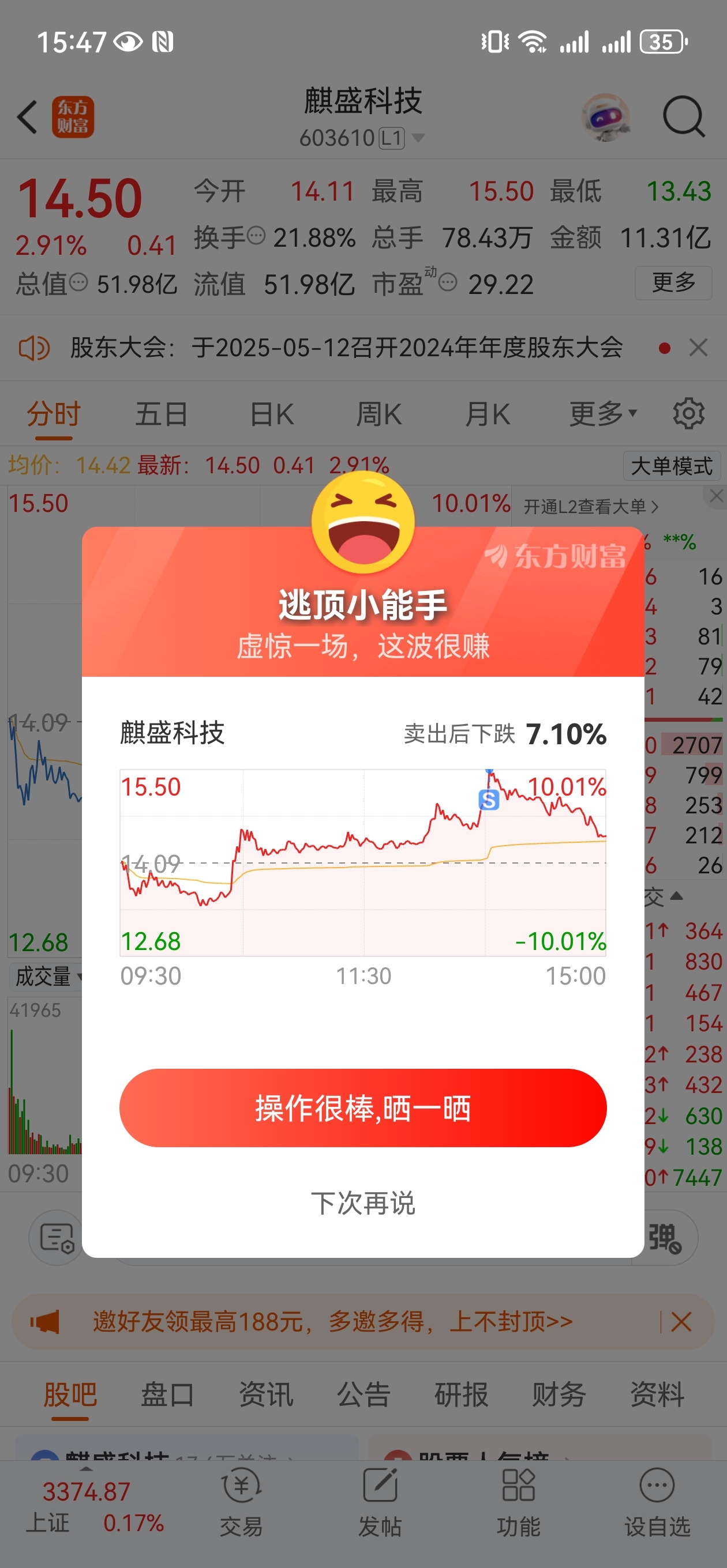 $麒盛科技(SH603610)$ 如果明天飞不起来就是鱼尾行情了,留下的发财。等两天可能有回头草能吃一口