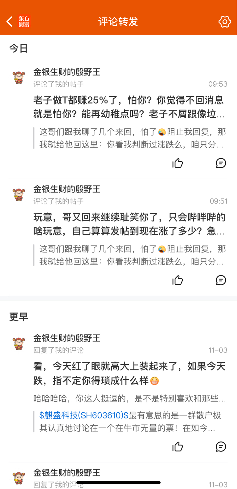 $麒盛科技(SH603610)$ 像股吧里这种货色,真的绝了,娘们都没他ws,拉黑了一个人还念念不忘,其实股市就是一个考验人性的地方,这种“偷感”极强的人在股市最终只能是韭菜,可能这一点只有这轮牛市结束他才能悟道吧